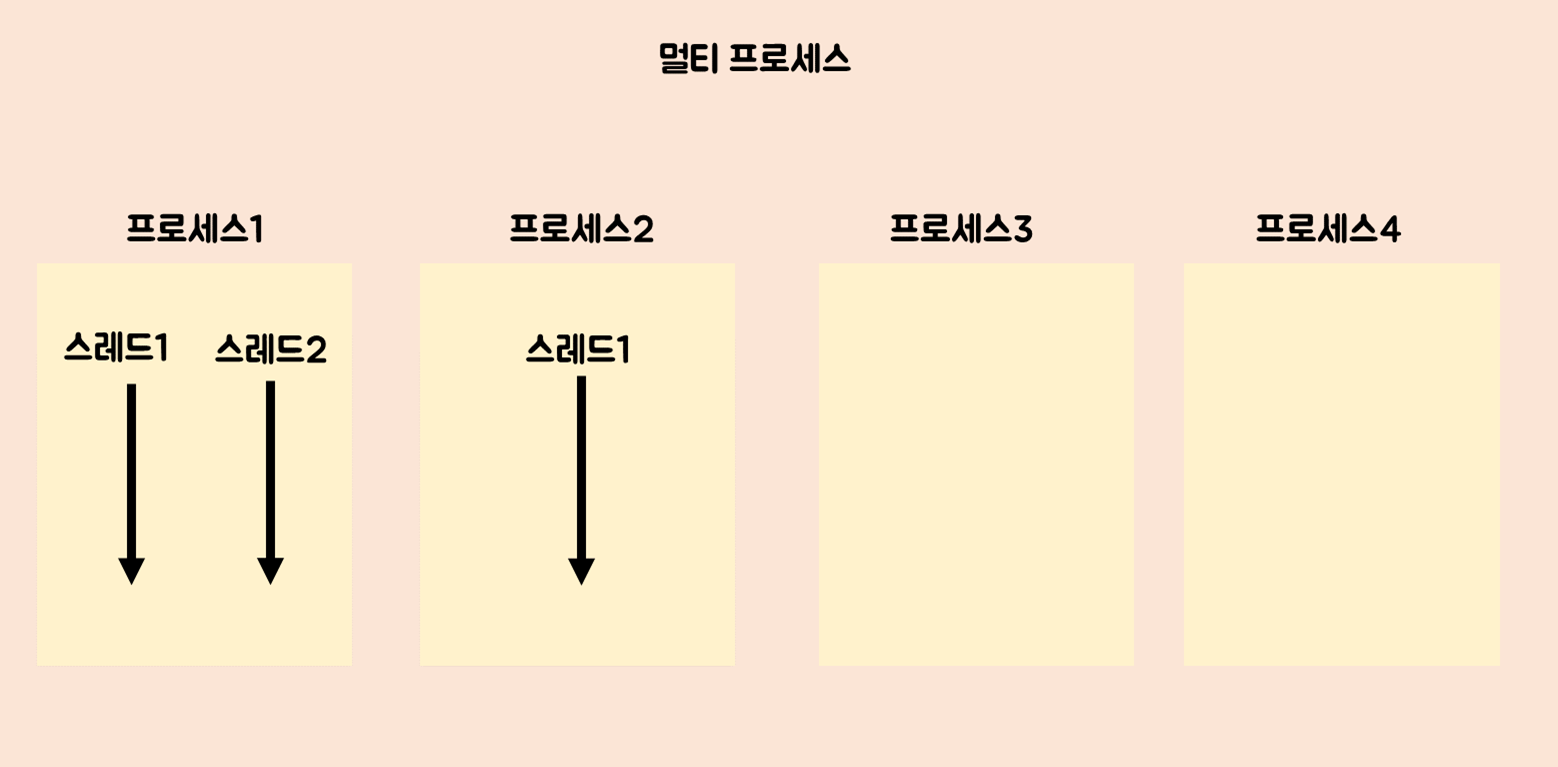 | 프로그램을 동시에 여러 개 사용할 때 프로세스가 각각의 프로그램에 하나씩 배정되어 멀티 프로세스로 처리합니다. | 프로그램의 내부에서 멀티태스킹이 이루어질 때 사용. |