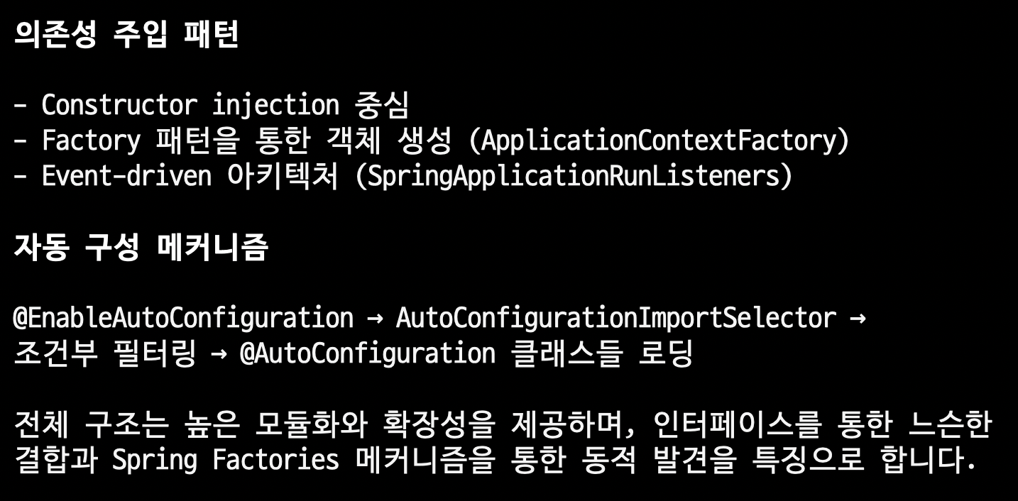 저장소를 클론하고, 핵심 아키텍처와 의존성 주입 패턴, 자동 구성 메커니즘까지 잘 소개해주었습니다. 추가 질의도 진행해서 더 많은 정보를 뽑아낼 수 있네요!