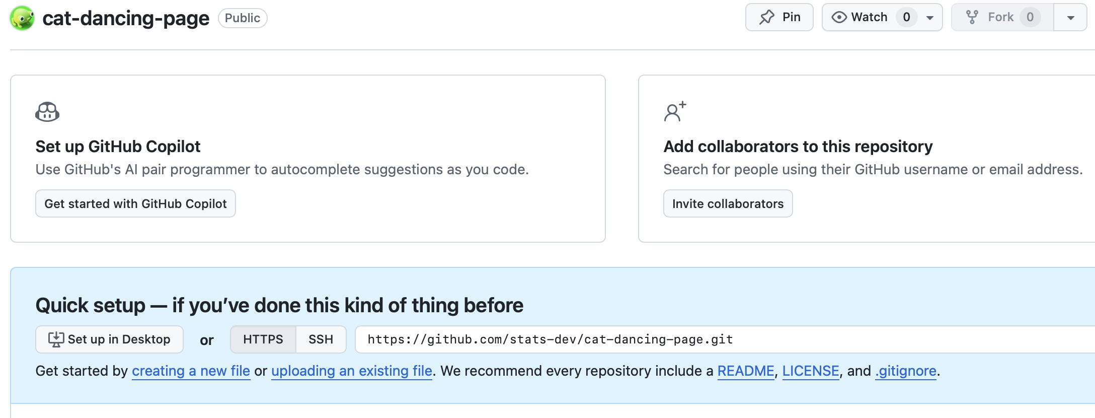 "저장소 주소는 "https://github.com/stats-dev/cat-dancing-page.git". 2단계를 실행해줘요"