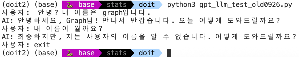 실행해보니, Graph라는 이름을 제시해도, 이후에 물어볼 때는 내 이름을 기억하지 못합니다.