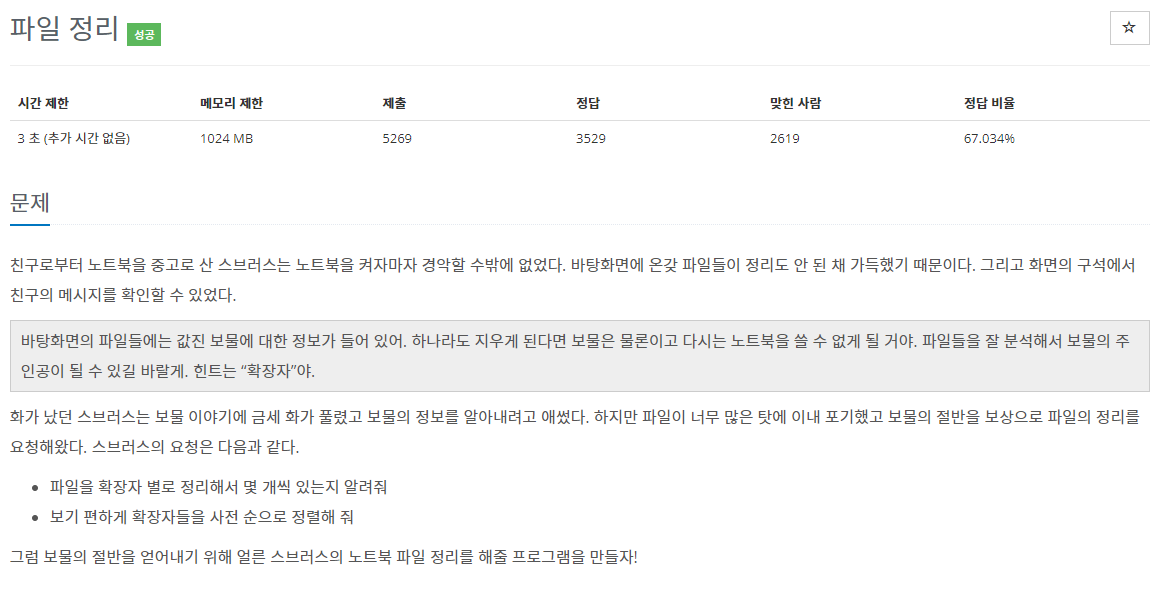 파일을 확장자 별로 정리해서 개수를 정리합니다. 이것을 확장자 기준 사전 순으로 오름차순 정렬하여 출력합니다.