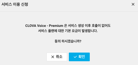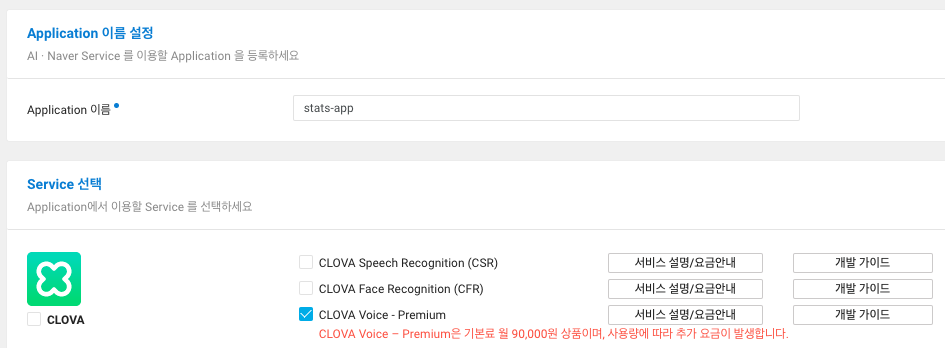 아래 처럼 Application 이름을 설정하고 Service에는 CLOVA Voice -Premium을 선택합니다. 월 9만원이 기본료로 결제되니 주의해주시길 당부드립니다. 아래 경고창을 잘 확인해주세요!