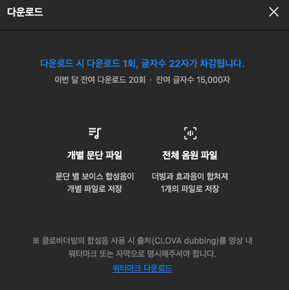 다운로드 시 횟수가 매달 20회이고 잔여 글자수도 해당 문구에서 확인할 수 있습니다. 다만 출처 표기의 일환으로 워터 마크를 명시해야하는데요. 저는 오디오 컨텐츠만 제공하므로 아래 문구를 음성으로 컨텐츠 시작 부분에 삽입하겠습니다.