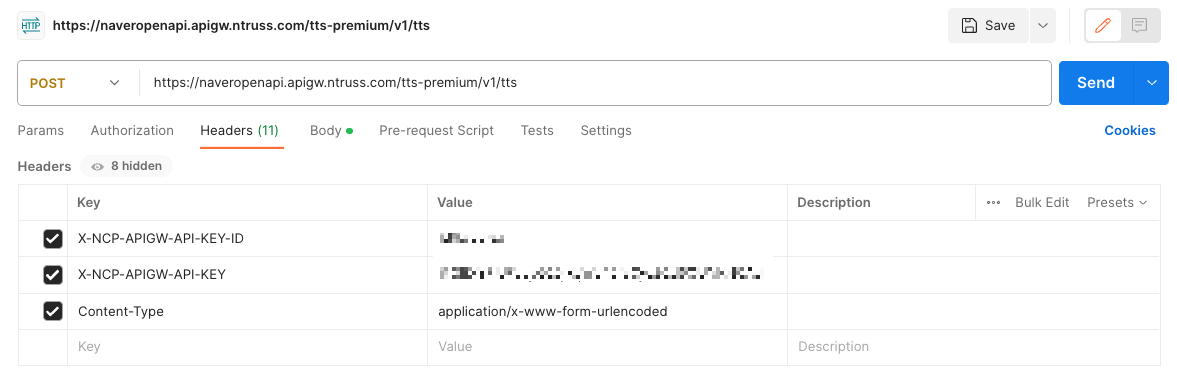 | POST | https://naveropenapi.apigw.ntruss.com/tts-premium/v1/tts |