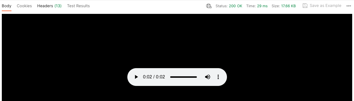 Send 버튼을 누르면 아래 결과창에 음성 파일이 출력됩니다. 여기서 Save as Example 우측 버튼을 눌러서 .mpga 형식으로 저장해서 들어볼 수도 있어 편리합니다.