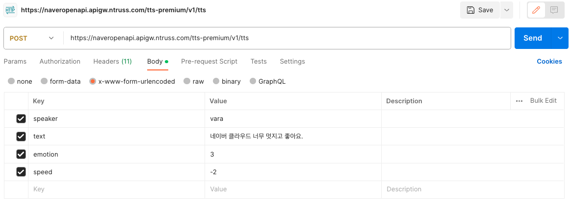 여기에 Body에도 입력하는데, x-www-form-urlencoded를 선택해서 입력합니다. 여기서 앞서 봤던 파라미터(감정 파라미터 포함)해서 모두 입력해줍니다. 저는 vara라는 화자(한국어, 여성)를 선택하고, text에는 목소리로 변환할 텍스트를 입력해줍니다. emotion은 3(분노)로 설정하고 speed는 -2로 조금 빠르게 설정했습니다.