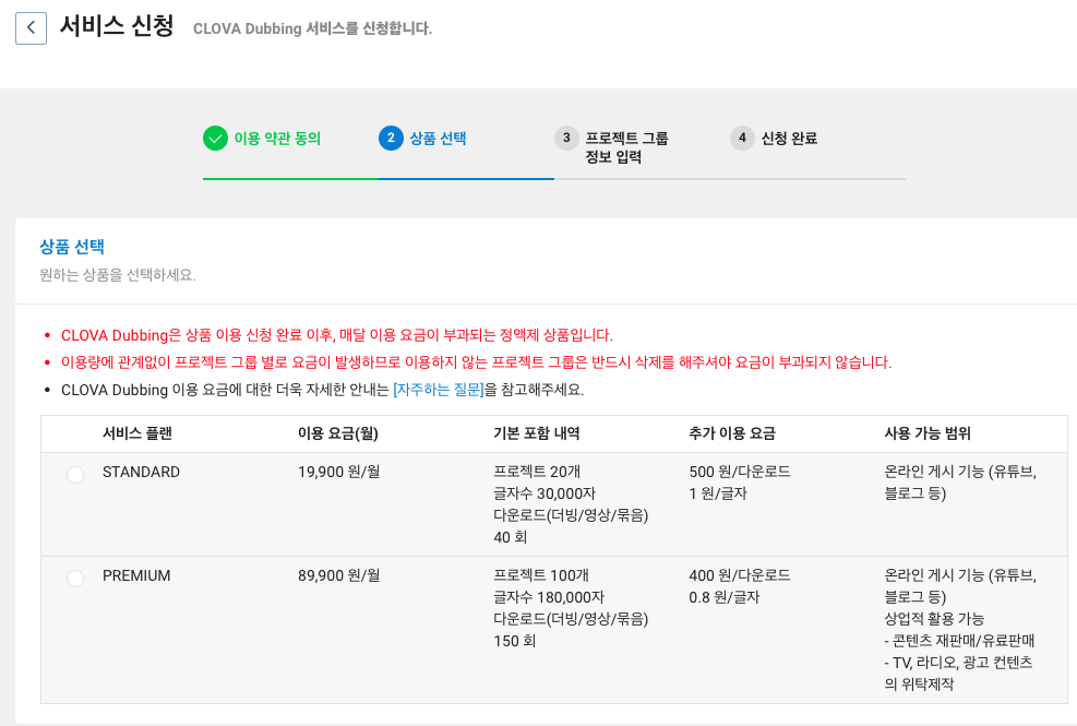 누르면 아래와 같이 서비스 신청화면이 나오는데요, 서비스 플랜(STANDARD, PREMIUM)에 따라 기본 요금(월), 추가 이용 요금이 다르고, 사용 가능 범위와 포함 내역을 고려해서 전략적으로 선택하시면 되겠습니다. 저는 온라인 게시 기능만 가능한 STANDARD를 선택했습니다.