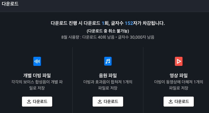완성했다면 다운로드 버튼을 누릅니다. 그러면 아래 한도를 소개하고, 파일을 선택해서 저장합니다. 저는 영상 파일로 선택해서 다운로드를 하겠습니다. 참고로, 무료 버전은 월 기준 20회 다운로드, 글자 수 15000자였습니다. 유료 중 STANDARD는 다운로드 40회, 글자수 30000자 이고, PREMIUM은 150회 다운로드, 180000자 글자 수 제한입니다.