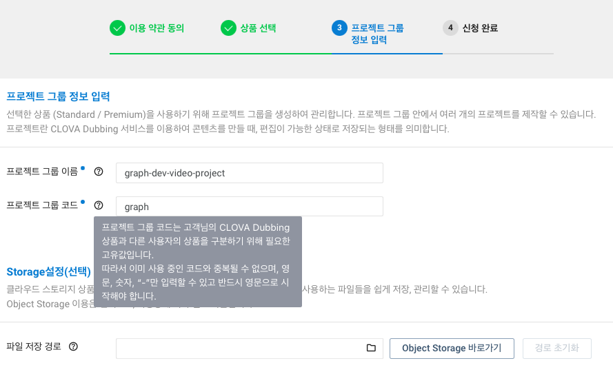 프로젝트 그룹 이름, 코드가 있습니다. 이름은 본인이 원하는 이름으로 하되 영문, 숫자, "-" 표기만 사용할 수 있으며, 프로젝트 그룹 코드도 마찬가지로 영문, 숫자, "-" 표기만 사용 가능합니다. 다만, 코드의 경우, 다른 사용자와 구분을 위해 유일한 값으로 설정해야합니다. 전략적으로 원하는 코드를 선점해두면 되겠습니다. 그 외에 Storage 설정을 해두면 Object Storage라는 원격 저장소에 프로젝트 영상 등의 파일을 저장할 수 있으며, 스토리지 비용이 별도로 발생한다고 합니다.