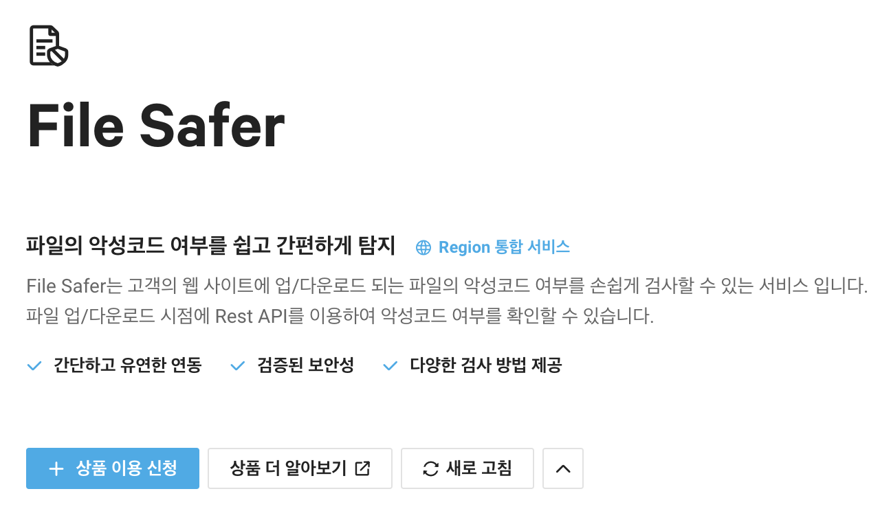먼저 네이버 클라우드 플랫폼에서 콘솔창으로 들어가서 서비스 중 Security > File Safer로 이동하면 아래와 같은 화면이 나타납니다. 상품 이용 신청을 눌러주세요.
