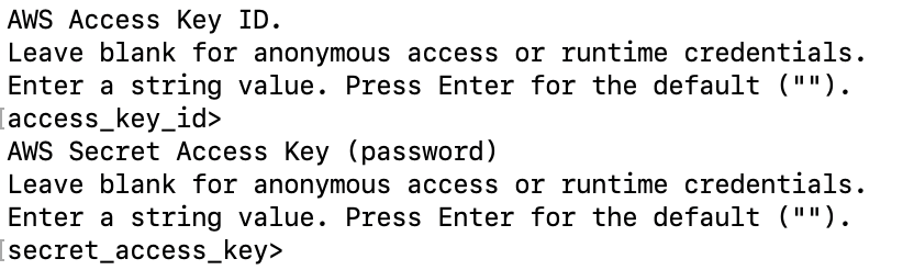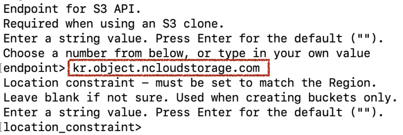 또한, 그 아래 location_constraint을 묻는 부분은, region을 입력하지 않았으므로, 그냥 비워두고 바로 엔터를 입력합니다.