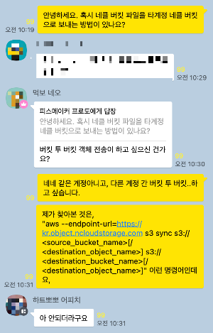 비록, 인바운드가 아닌 아웃바운드 전송비용이 부과되기는 하지만, 가볍게 테스트 용도로는 활용해볼 수 있을 것이라 생각합니다. 다음에는 s3 browser라는 도구로도 서로 다른 두 네이버클라우드 계정의 버킷에서 파일 전송을 시도해보겠습니다.