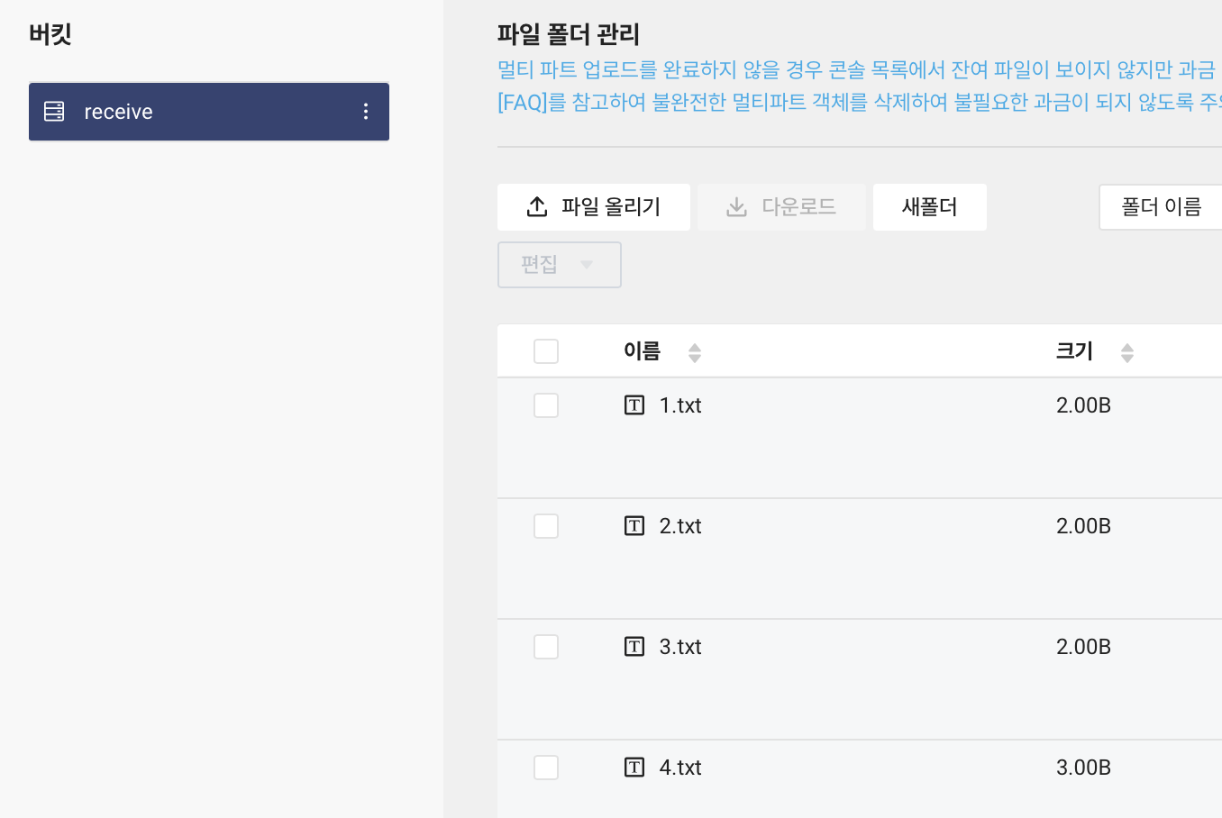 그 결과를 확인해보겠습니다. 문제가 없다면, send 버킷은 그대로일 것이고, receive 버킷에는 send 버킷에 있는 1.txt, 2.txt, 3.txt, 4.txt 파일이 추가되었을 것입니다.