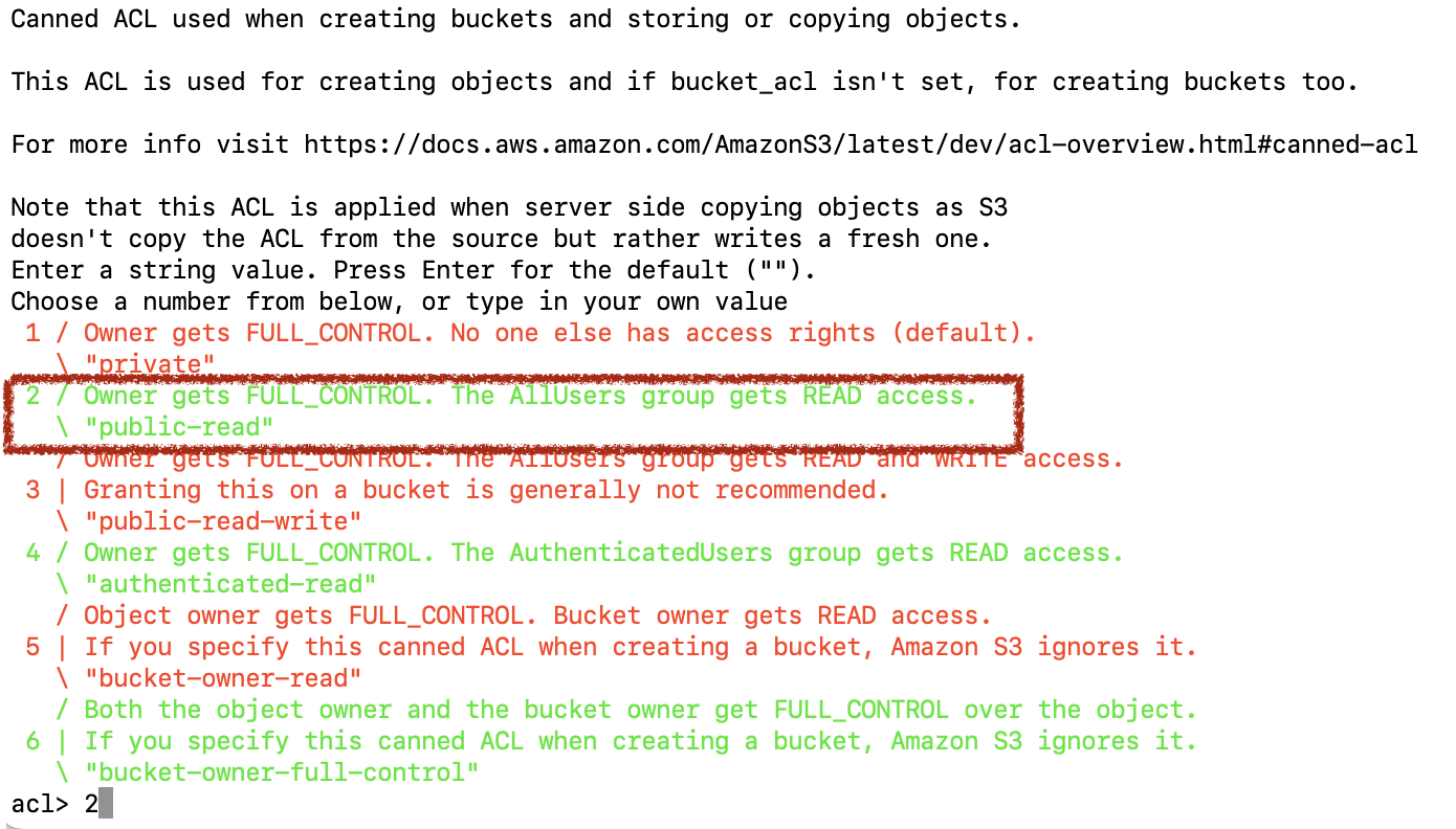 다음은 서버측의 ACL 설정인데, 저는 테스트용이므로 과감하게 2번 public-read를 사용했습니다. 실제 상황에서는 필요한 권한을 최소로 설정해주는게 좋다고 합니다.