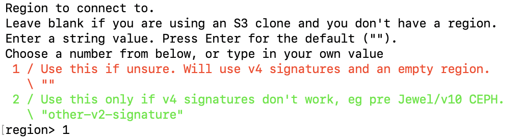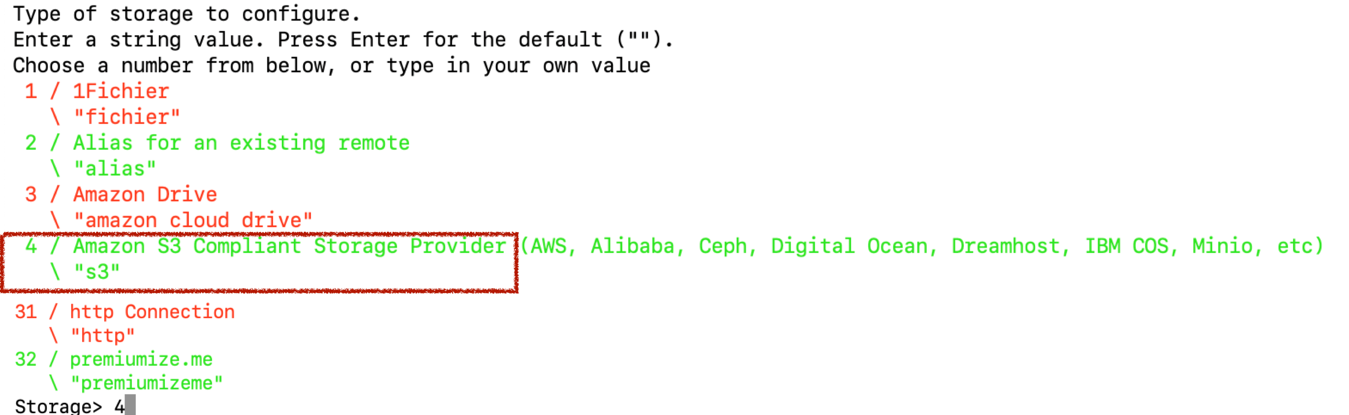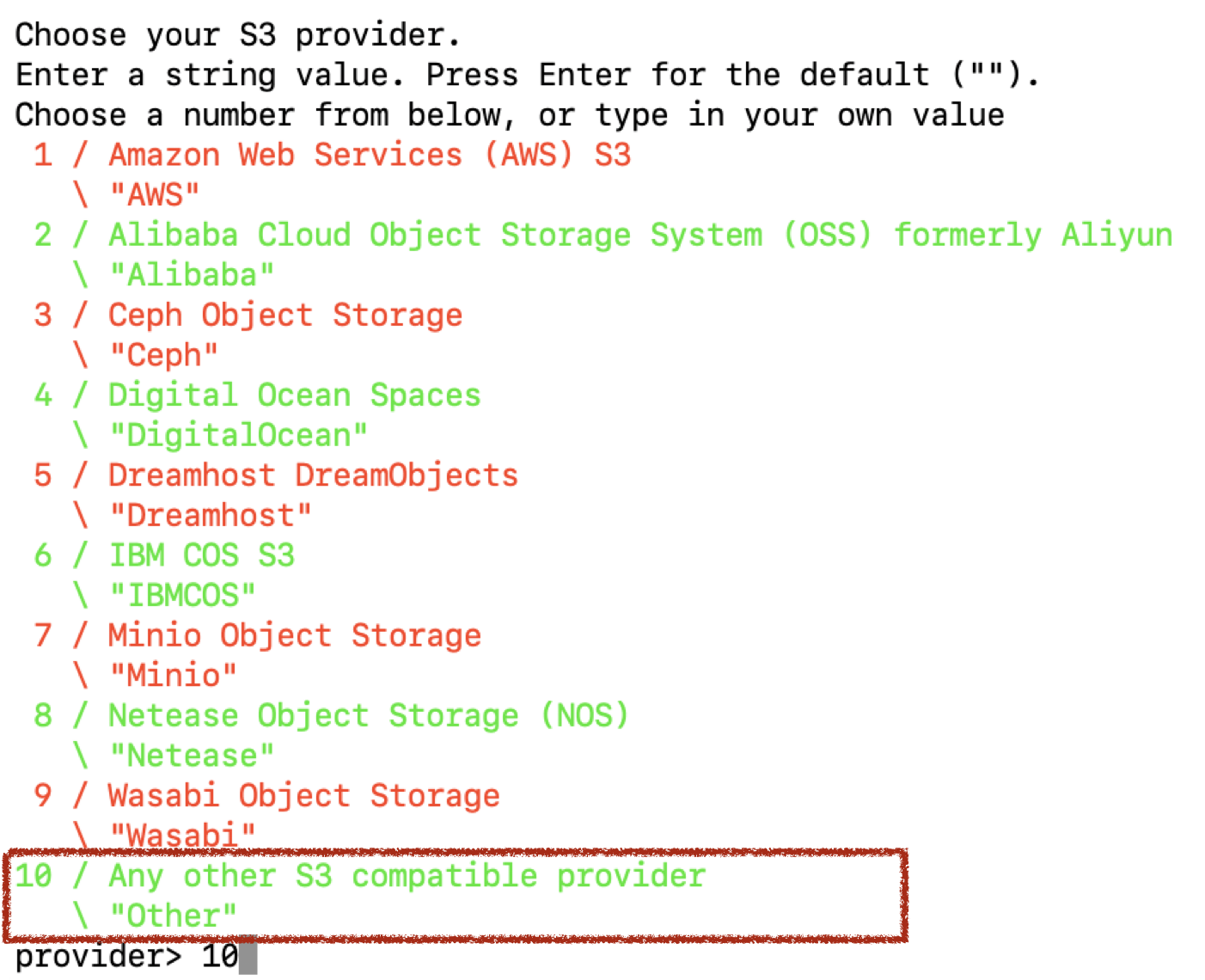 위에서 고른 4번 이후, 더 구체적인 S3 provider를 고를 수 있습니다. 여기서 10번인 Other를 선택했습니다.