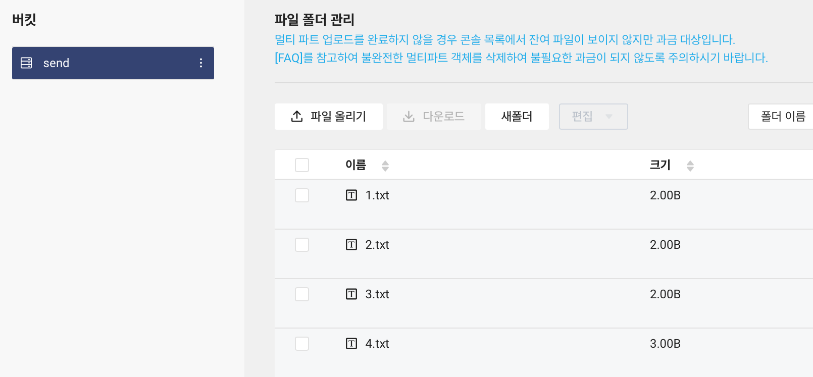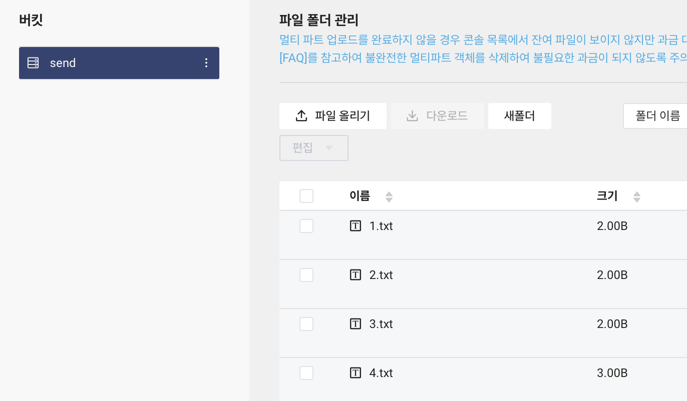swfit의 send 버킷에는 1.txt, 2.txt, 3.txt, 4.txt 파일을 확인할 수 있습니다.