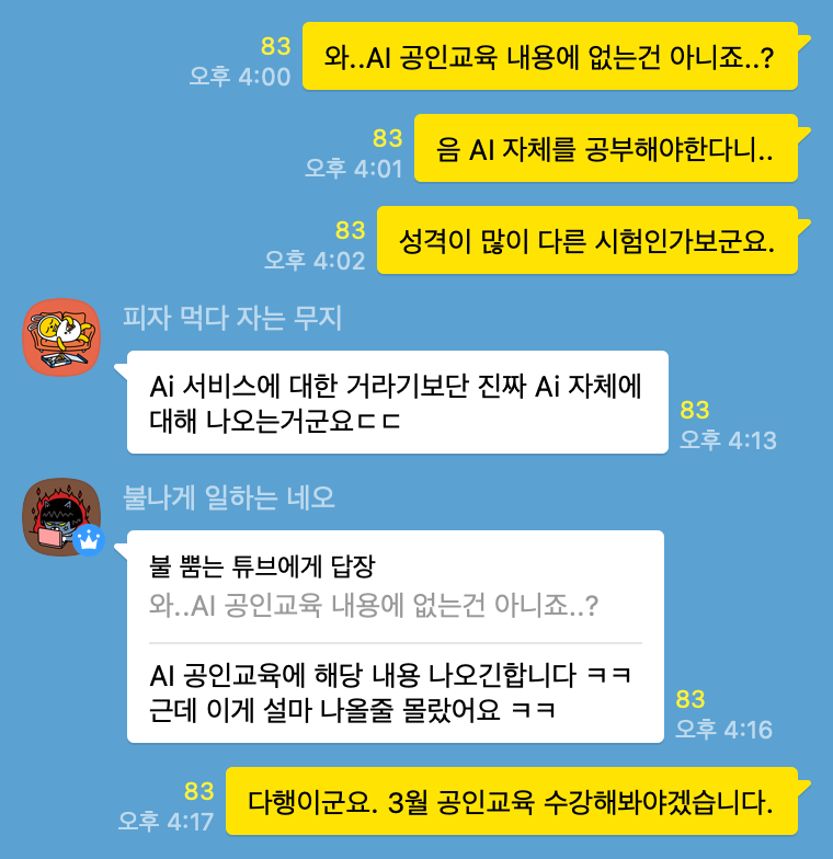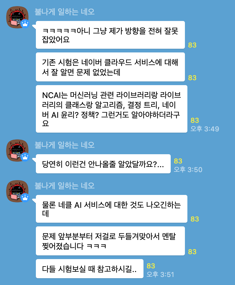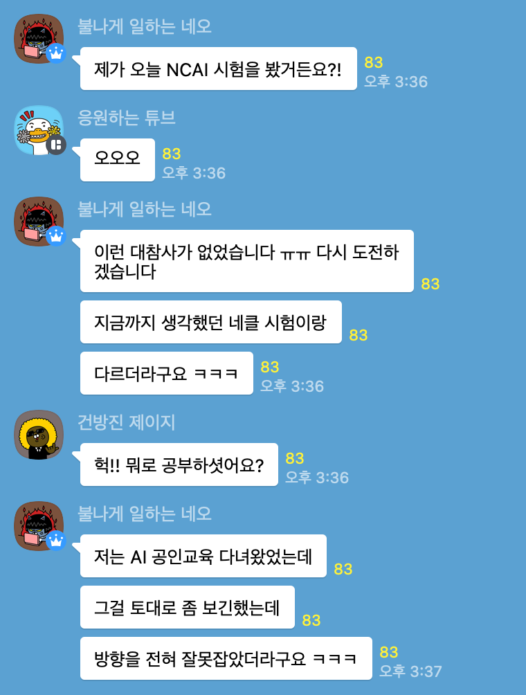 그러나 작성 시점인 2월 24일 기준으로 블로그 후기 정보를 얻을 수가 없고, edwith 등에 올라오는 온라인 공인교육도 없었습니다. 따라서 커뮤니티에 미리 시험을 치르신 분의 이야기가 있어 담아보았습니다. NCUC 오픈 채팅방의 내용을 캡쳐했습니다. 아무런 정보가 없다보니, 이런 후기 한마디가 소중한 상황이어서, 이것도 정리해보았습니다.