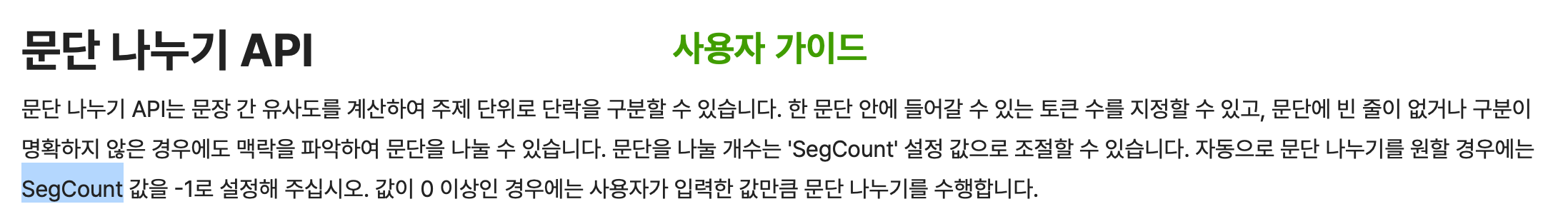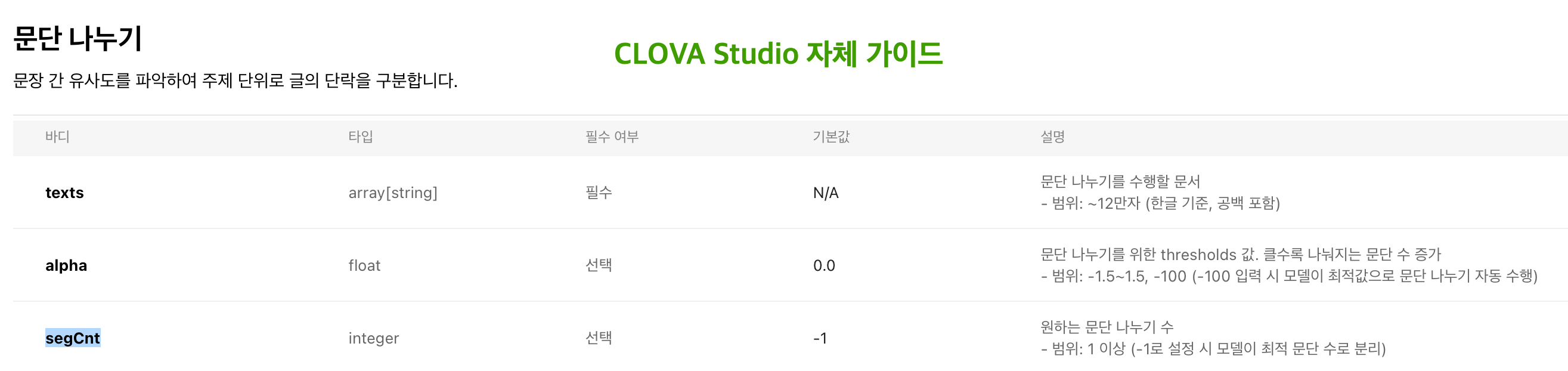 아래는 사용자 가이드 > CLOVA Studio 사용 > 익스플로러 > API 사용 부분과 CLOVA Studio 페이지 가이드 예시입니다. 이렇게 사용자 가이드 문서는 갱신되지 않은 파라미터(segCount) 같은 게 있는데, 이런 것은 CLOVA Studio 자체 가이드에 나온 파라미터(segCnt)로 최신화해서 알아두셔야 합니다.