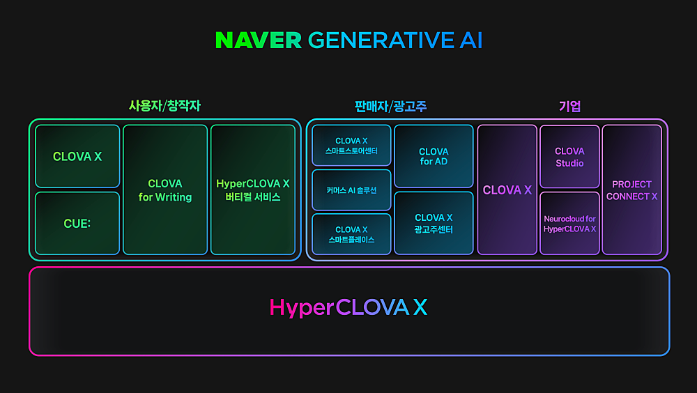 CLOVA-X, AI cue, HyperCLOVA, HyperCLOVA-X 등 네이버의 다양한 서비스도 대략적으로 구분해주시면 좋습니다. 크게 보려면 DAN 23의 소개 영상에 나온 아래 그림도 공부하기에는 좋았습니다. 해당 그림에서 각 서비스의 대상이 누구(사용자/창작자 vs 판매자/광고주/기업 등)인지 정도는 구분하면 좋습니다.