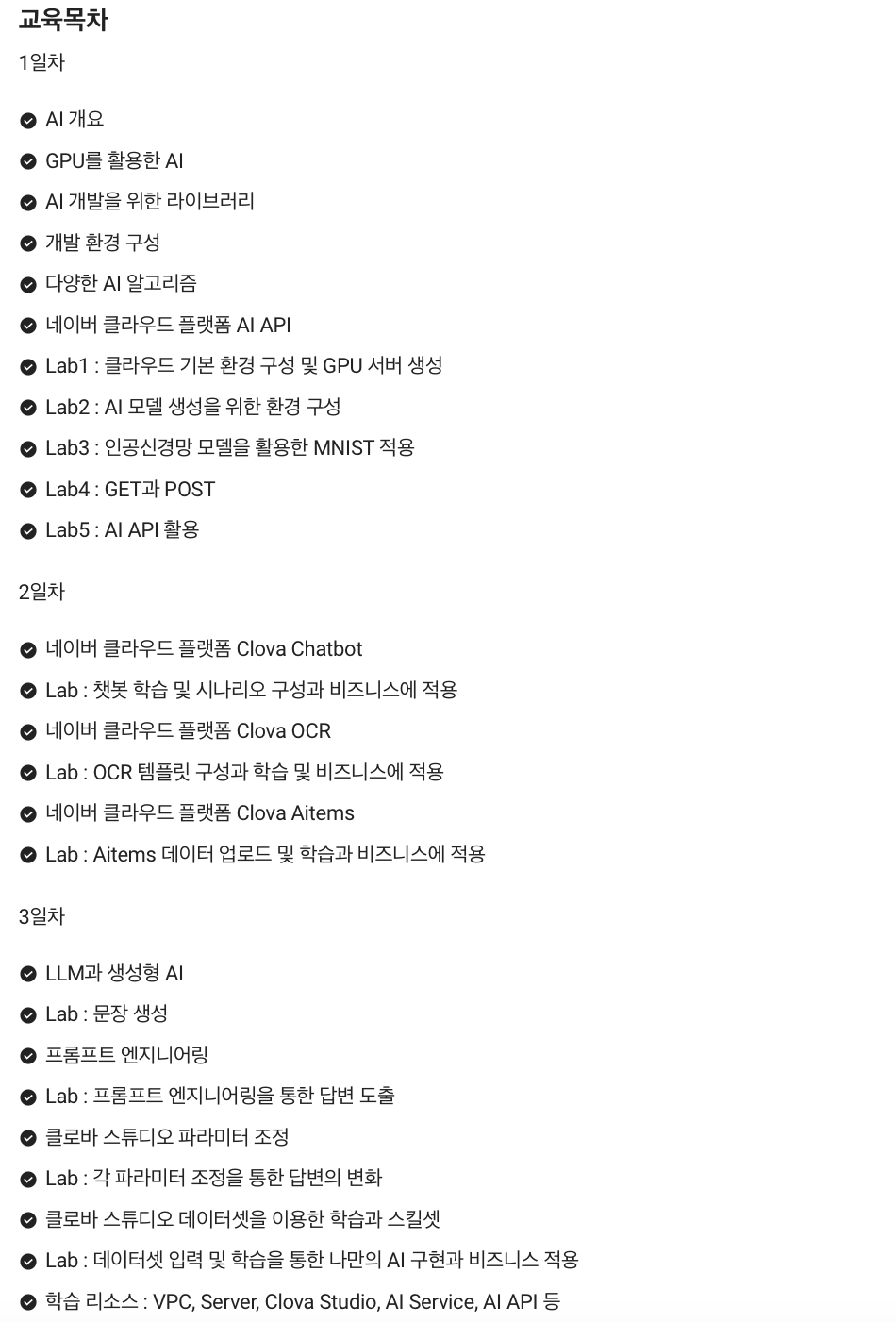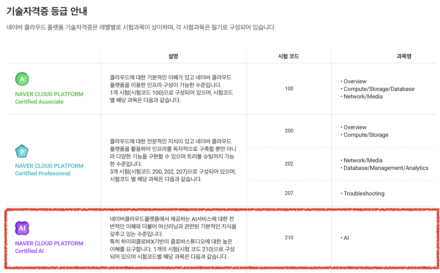 먼저 힌트를 얻고자 네이버클라우드에서 제공하는 공인 교육 커리큘럼을 살펴보았습니다.