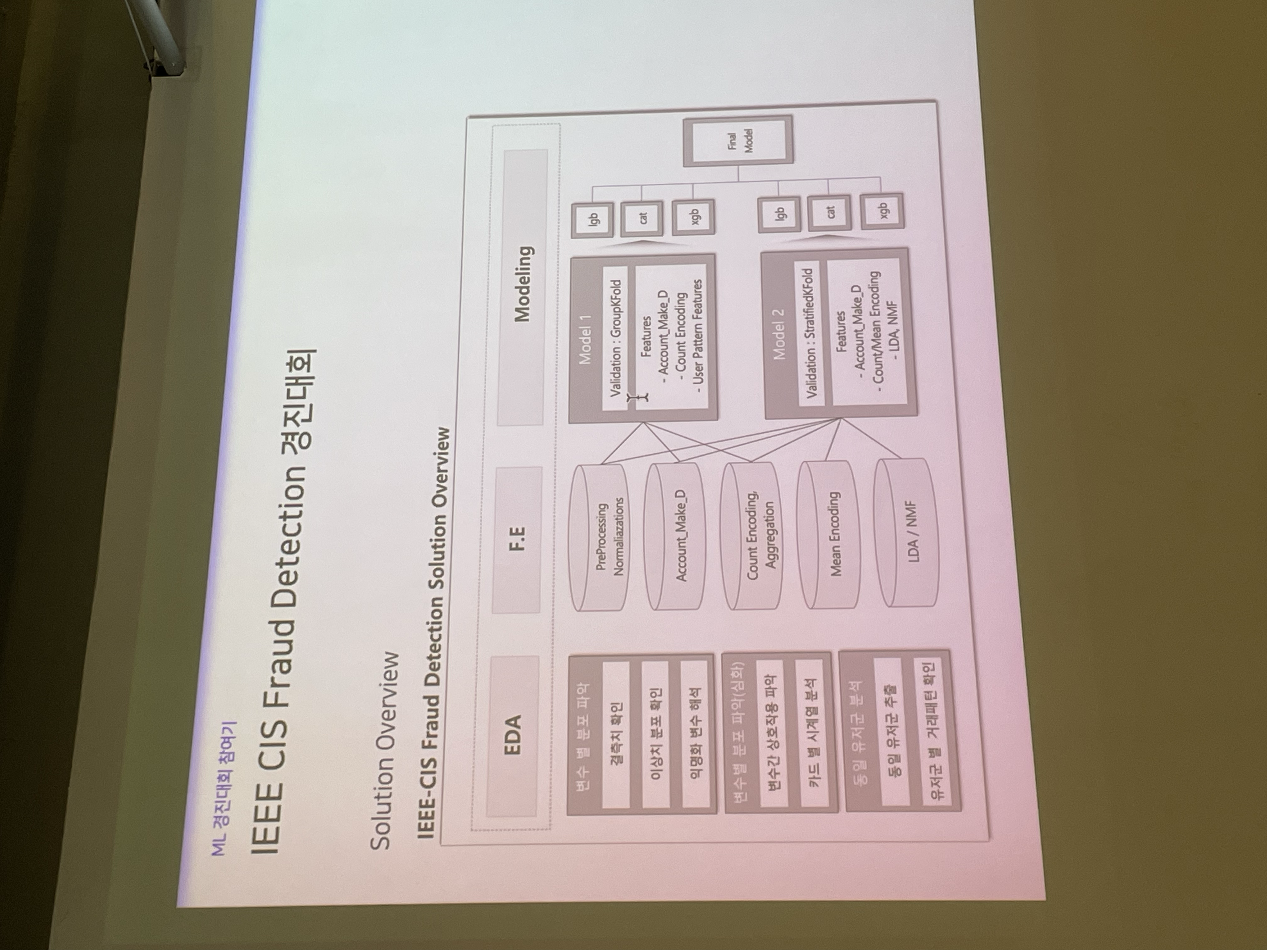총 두가지 대회의 후기를 공유해주셨다. IEEE CIS Fraud Detection 경진대회로, 캐글 대회였다. 요새는 이러한 정형 데이터 기반 ML 경진대회가 거의 안나온다고 하니 잘 알아두기만 하자.