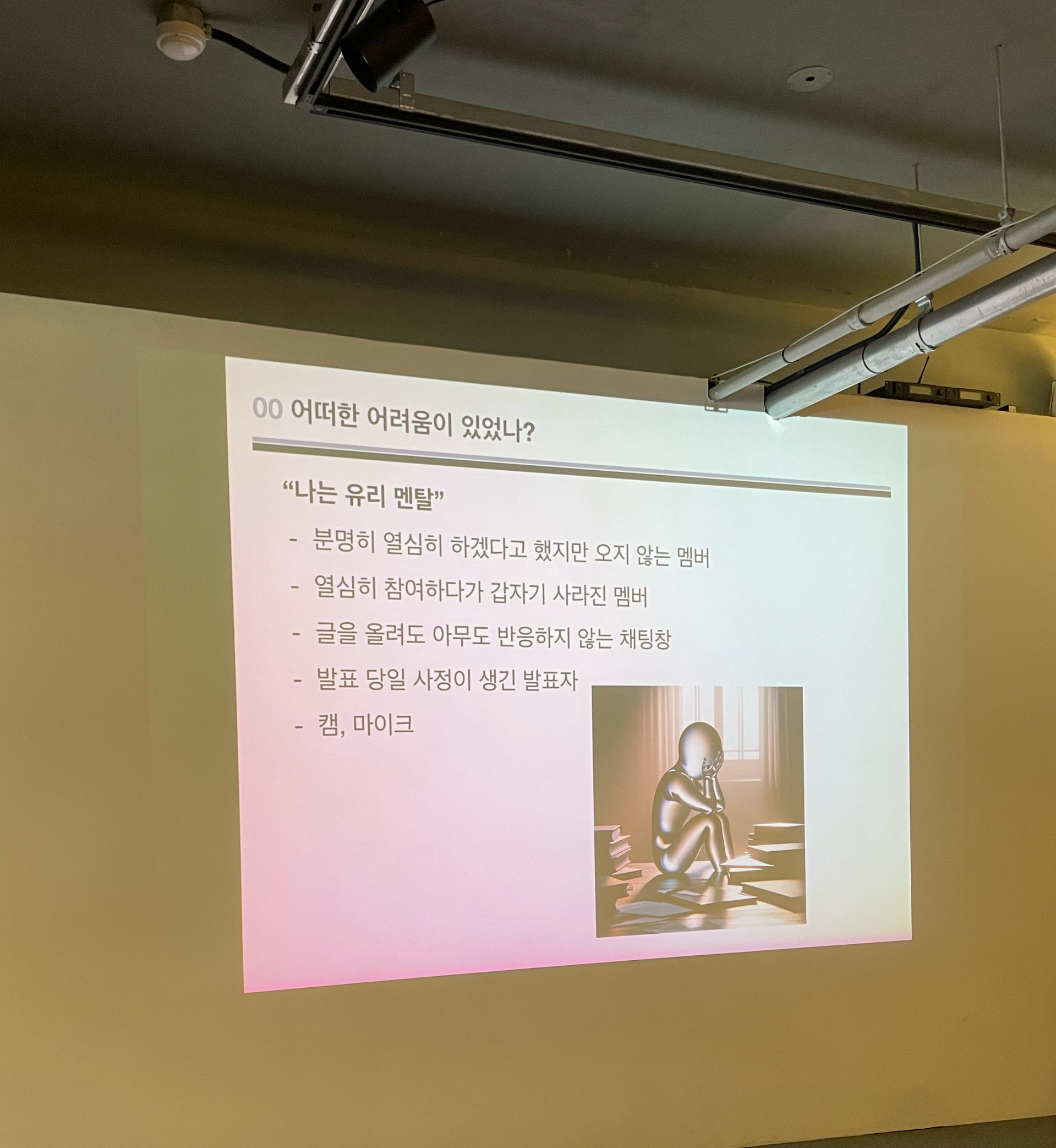 혼자 공감했던 슬라이드, 나의 유리멘탈 파트. 스터디 운영하면 늘 반응하지 않는 채팅방과 스터디원들의 차가운 얼굴을 마주해야한다. 의무가 아니다보니 늘 그렇고, 취업이나 시험 등으로 수많은 불참을 마주해야한다. 그 모든 것을 견디는 스터디는 훌륭한 스터디라 감히 말하겠다. 그 외에도 재밌는 발표 주제들을 보여주시며, 진행하고 있다니 궁금하기도 했다. 전반적으로 재밌게 듣고 공감하는 시간이었다.