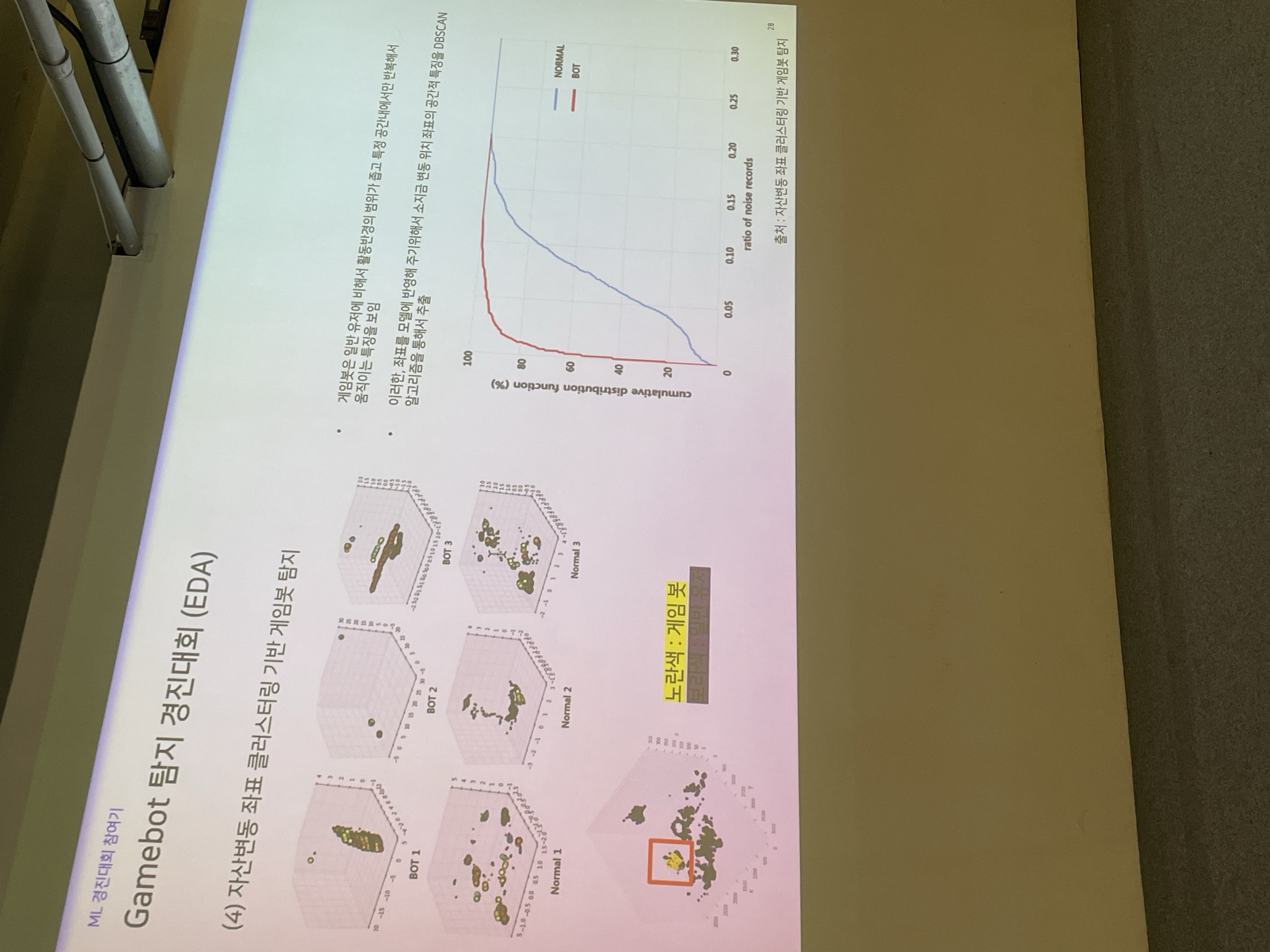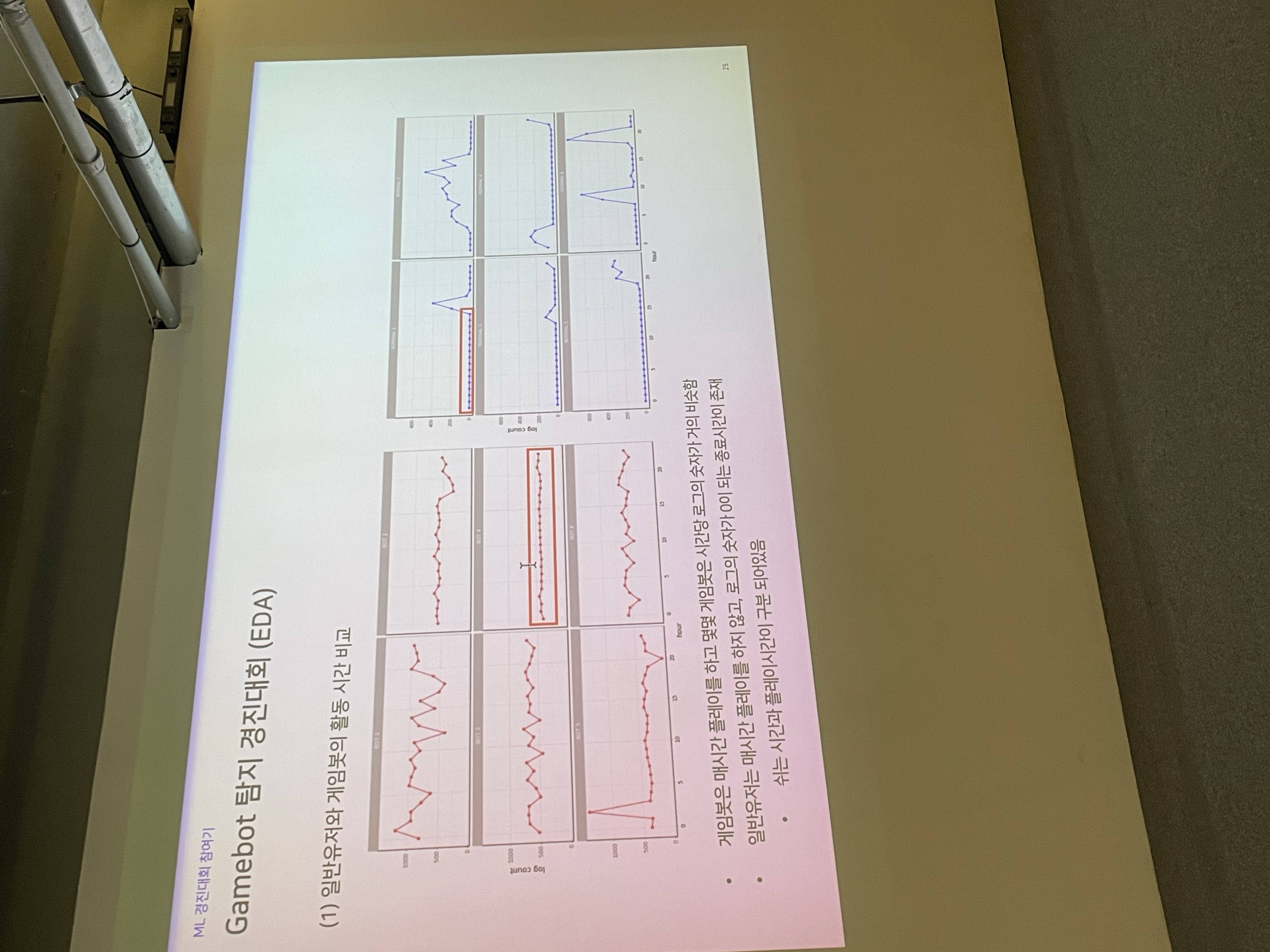 EDA 부분도 재밌게 들었다. 일반 유저와 게임봇의 차이를 시각적으로 살펴보고 몇가지 패턴을 보여주는데, 흔히 손크로라고 하는 사람들의 패턴이 아주 흥미롭다.