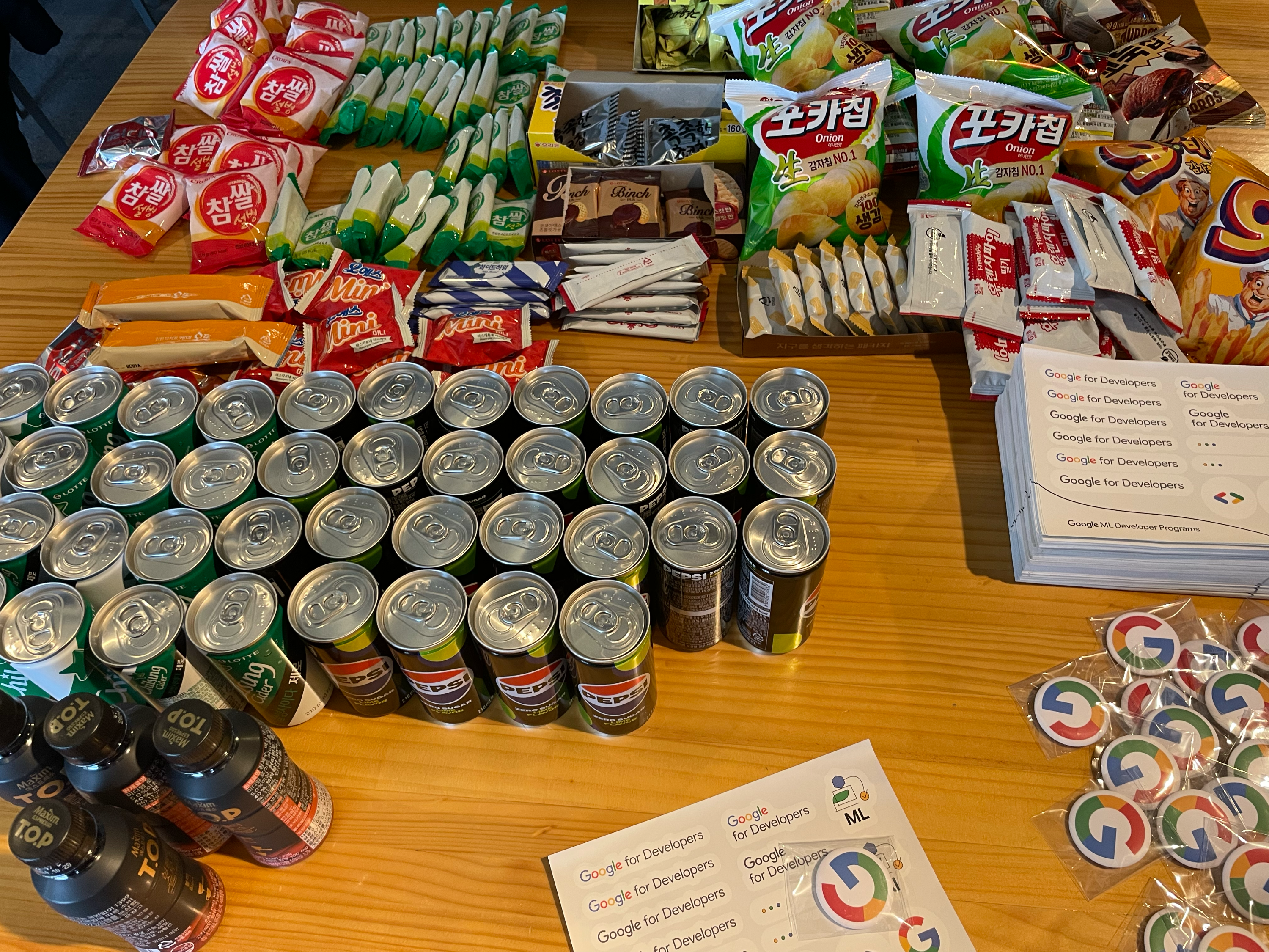 각종 간식과 스티커를 준비해두었다. 푸짐하고 좋다. 뒤에 물도 있어서 갈증을 잘 해소했다.