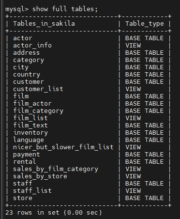 환경은 클라우드 서버로 하고, 아래와 같이 full tables가 나타나면 됩니다.