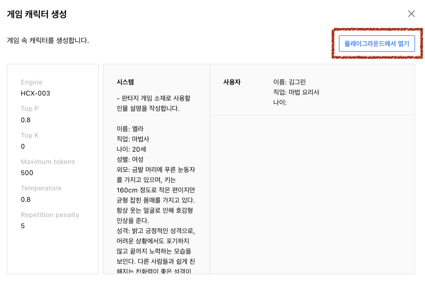 상세 내용에서 실제 엔진 및 파라미터 값들을 확인하고, 시스템 지시문 등 구성을 한눈에 확인합니다. 테스트를 해본다면, "플레이그라운드에서 열기"를 눌러서, 직접 실행하고 답변을 보면서 확인해볼 수 있습니다.