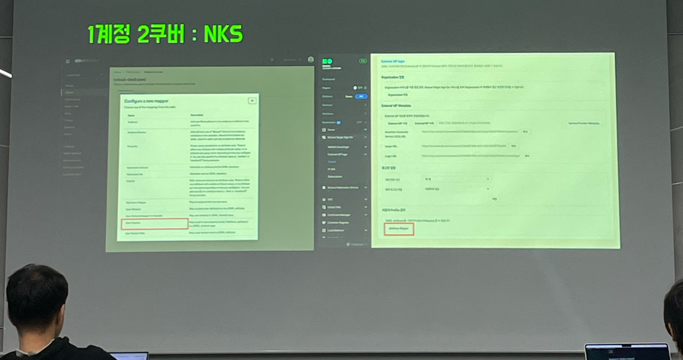 NKS 클릭 시 OIDC 인증 설정을 할 수 있습니다. 키클락 화면과 네이버클라우드 화면을 한번에 보여주셨습니다. 두 화면에서 서로 상호작용하는 모습을 보여주기에 좋아보였습니다. 키클락에서 관련된 클라이언트 설정해주고, 키클락이라는 네이버가 아닌 제 3자의 정체불명의 누군가에 대해 설명해주는 설정을 했습니다.