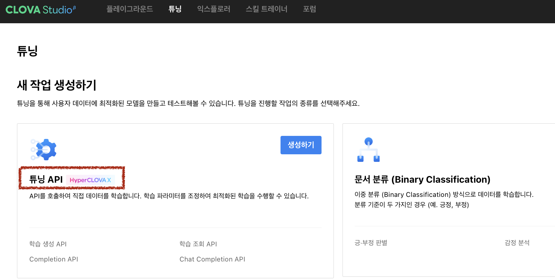다음으로 튜닝은 모델을 직접 학습할 수 있는 화면입니다. 만약에 예를 들어 도메인 특화된 모델을 만들고 싶을 때 사용합니다. 예를 들면, 의료나 이커머스 같은 특정 분야에서 그에 관한 답변을 해주는 모델을 제작한다면, 튜닝 API를 통해 기본 LLM 모델을 해당 분야에 맞게 학습(튜닝)을 거쳐 한번 더 가공할 수 있습니다. 그 외에도 감정 분석, 문장 생성, 문장 요약 등 다양한 태스크에 맞는 모델을 생성을 할 수가 있습니다.