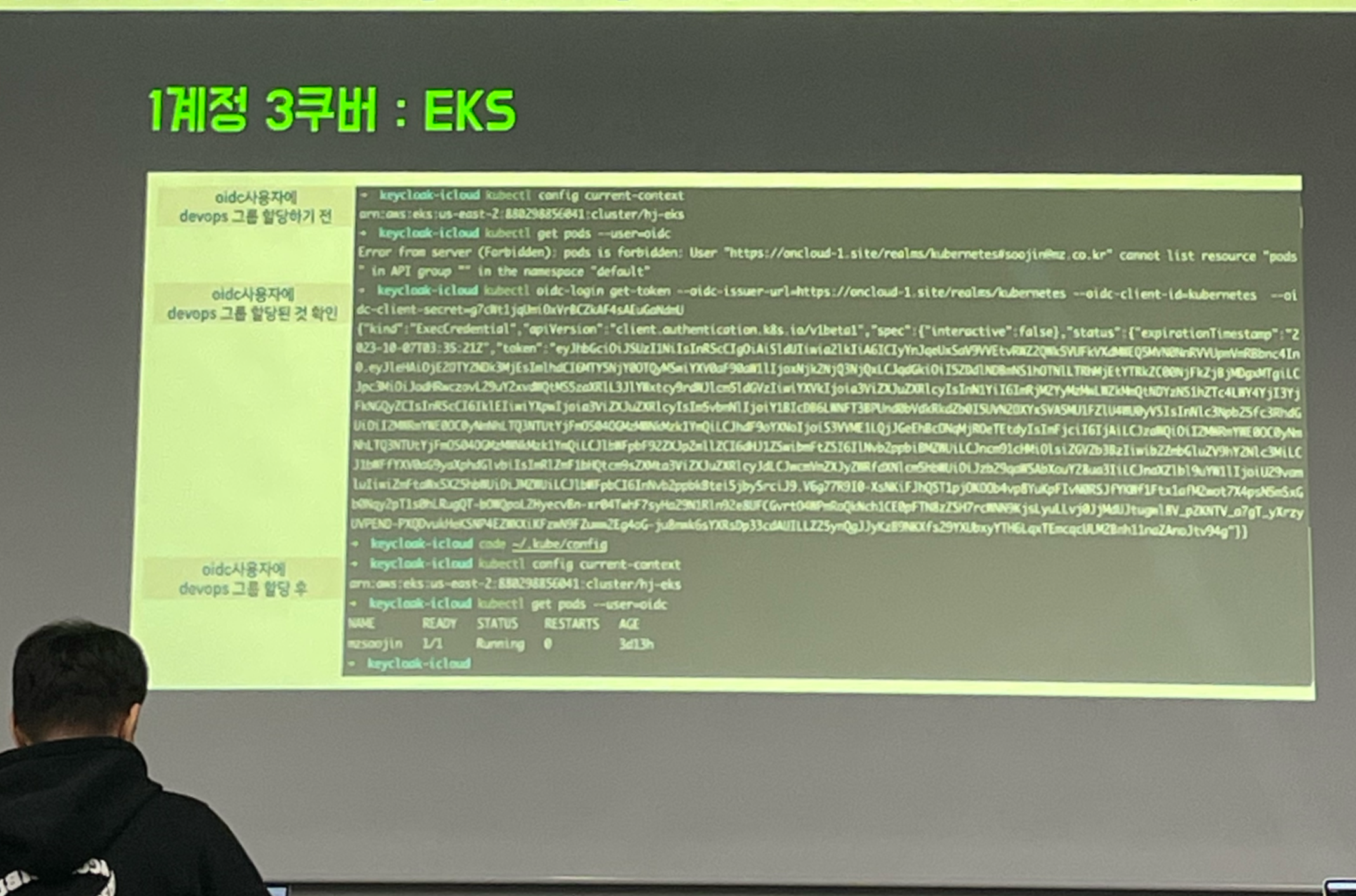 순서는 그룹에 할당하고 나서 → 토큰 받기 → OIDC 사용자에 devops 그룹 할당 → EKS 클러스터 및 리소스 접근 이렇게 진행됩니다.