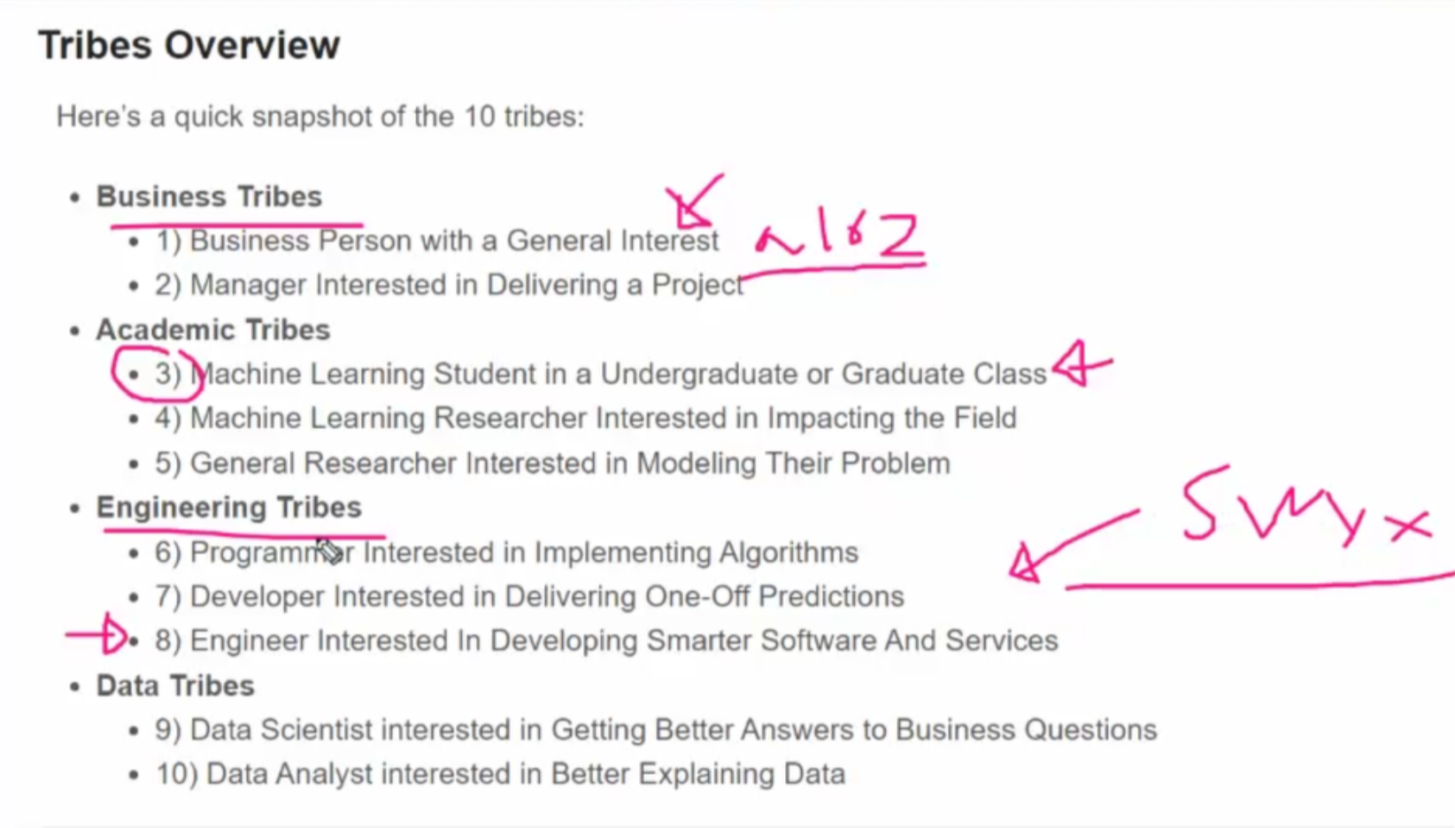 이번 모임에 새로 오신 분들 중에 "개발자"출신 분들이 많았습니다. 아무래도 AI 연구원에 비해서는 이론적 배경이 낮지만, 누구보다 실생활에 쓸만한 소프트웨어와 산출물 개발에 진심인 분들입니다. 그 분들은 주로, "Engineering Tribes"라는 유형에 적합할 수 있습니다. 각 유형을 살펴보았습니다. 본 글의 출처는, machine learning mastery라는 페이지에서 발췌하였습니다.