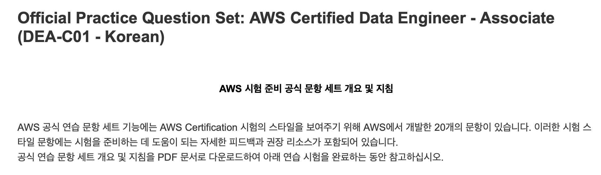 무료로 제공되는 20문항의 문제입니다. AWS 스킬빌더에서 제공해요. 별도의 유료 구독 없이 체험해볼 수 있습니다. 꼭 한번은 풀고 가시길 추천합니다.
