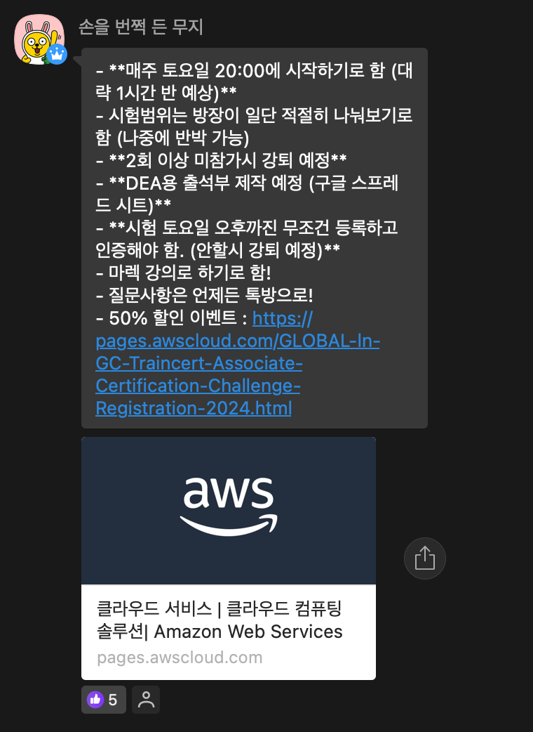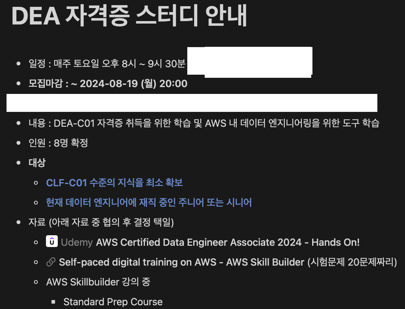 먼저 AWS DEA 자격증 스터디를 모집하는 글이 올라와서, 일단 신청하여 참여하게 됩니다.