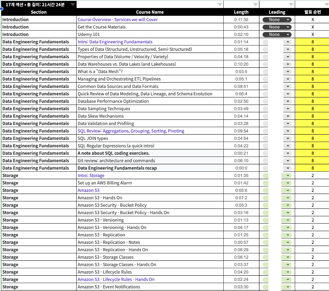 스터디에서 정한 콘텐츠는 Udemy의 유명 강사 마렉 & 케인의 DEA 강의입니다. 범위가 적지 않죠?