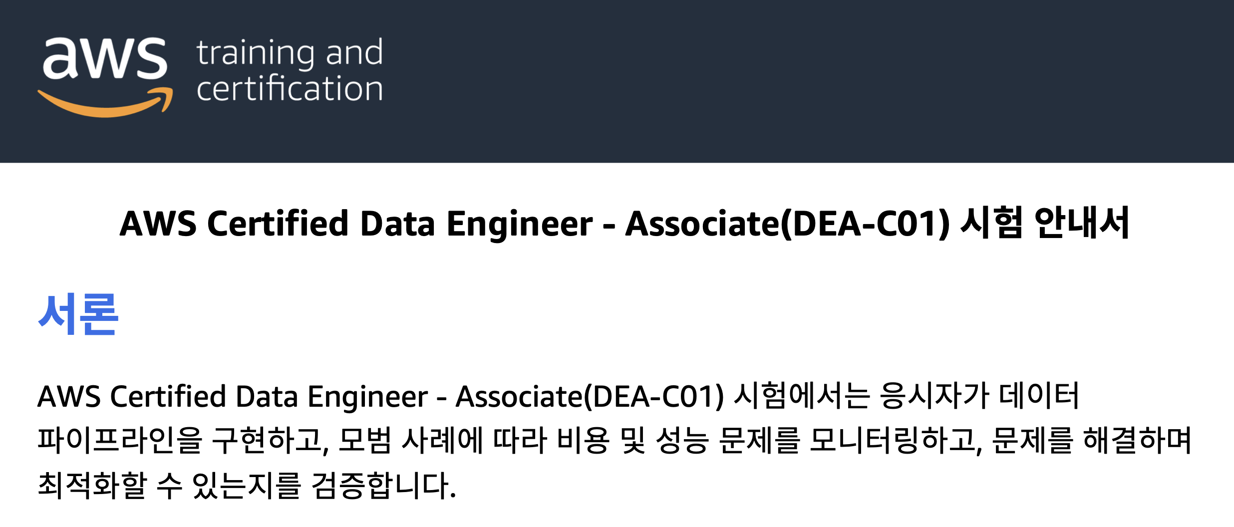 Data Engineer Associate, 한마디로 데이터 엔지니어가 갖추어야할 기본 시험입니다. 준비한지 한달남짓 되었고, DEA 스터디를 시작한다는 말을 듣고 부리나케 준비하게 된 시험입니다.
