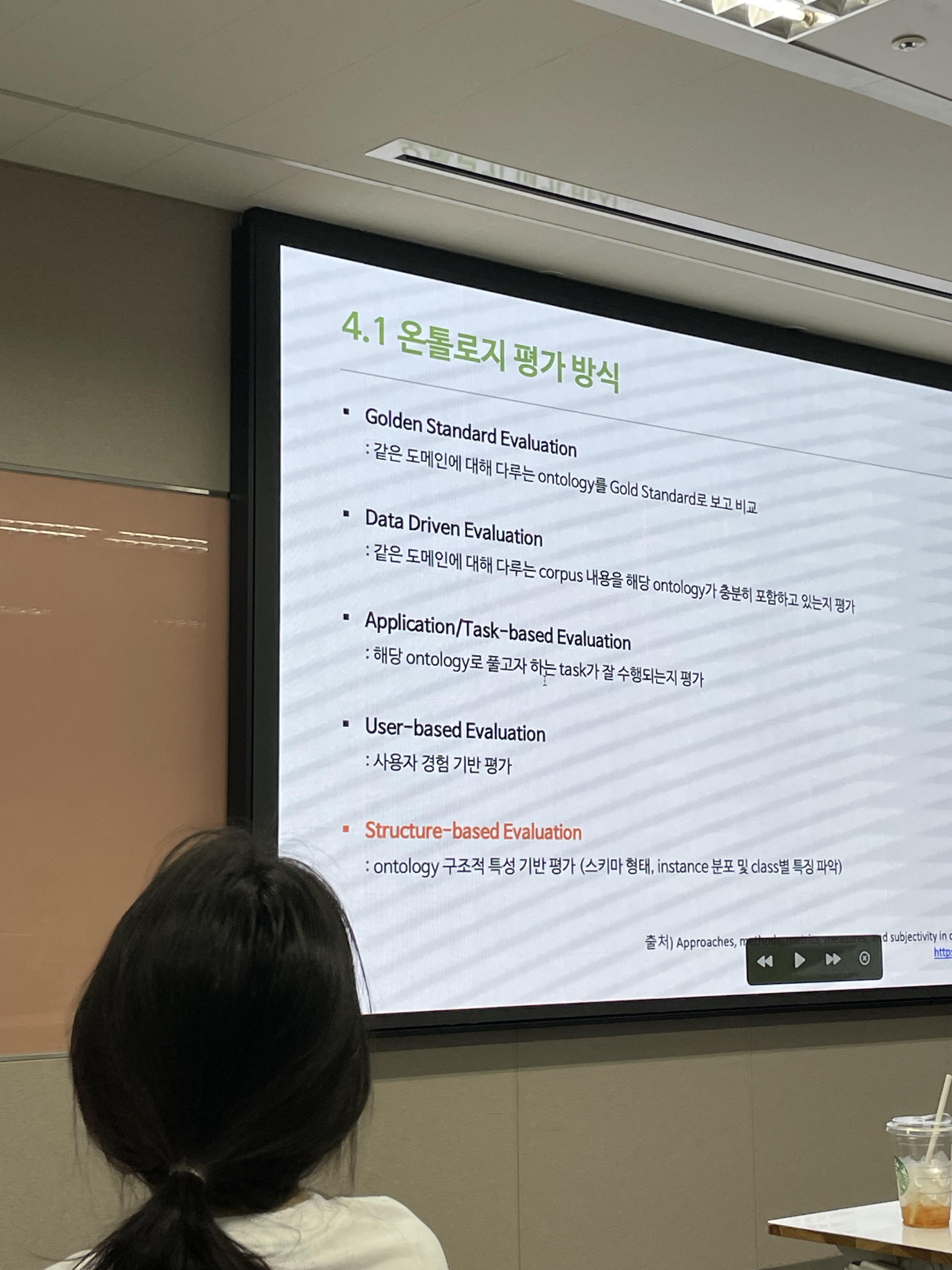 평가 방식과 지표는, 크게 Schema Metrics, Instance Metrics, Class Metrics을 바탕으로 확인했습니다. 여기서 한발 더 나아가 Class Granularity라는 세부 지표를 만들어 소개해주셨습니다. 클래스 만의 고유한 특징을 잘 담아내는 온톨로지 평가 지표를 만들어주셨고, 흥미롭게 들었습니다.