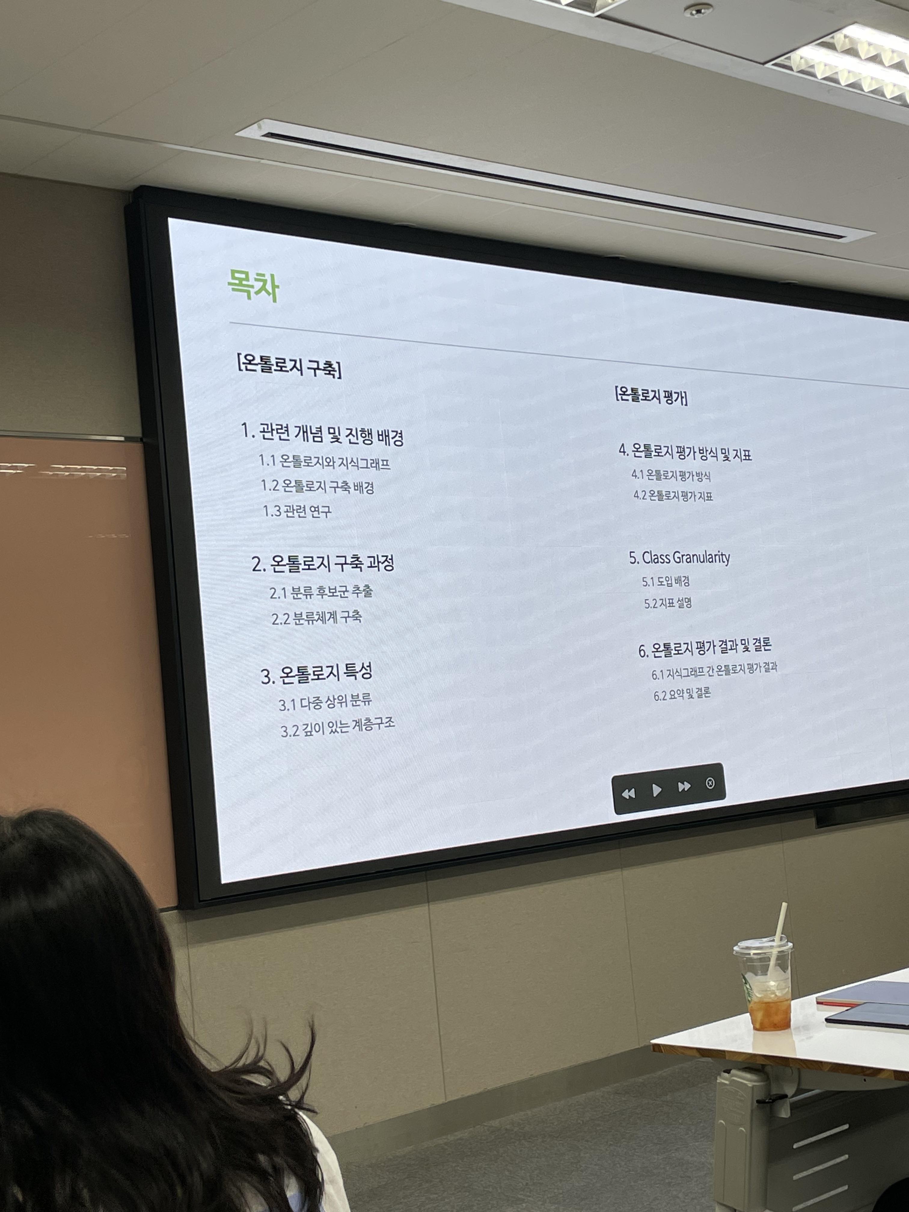 온톨로지 구축과 관련해서는 수동 구축, 말뭉치 이용, 위키미디어 분류 등의 연구를 수행하고 있습니다. 분류 후보군을 추출하고, 방향 비순환 그래프를 생성하고 그래프를 가지치기하게 되는 일련의 과정이 있다고 합니다.
