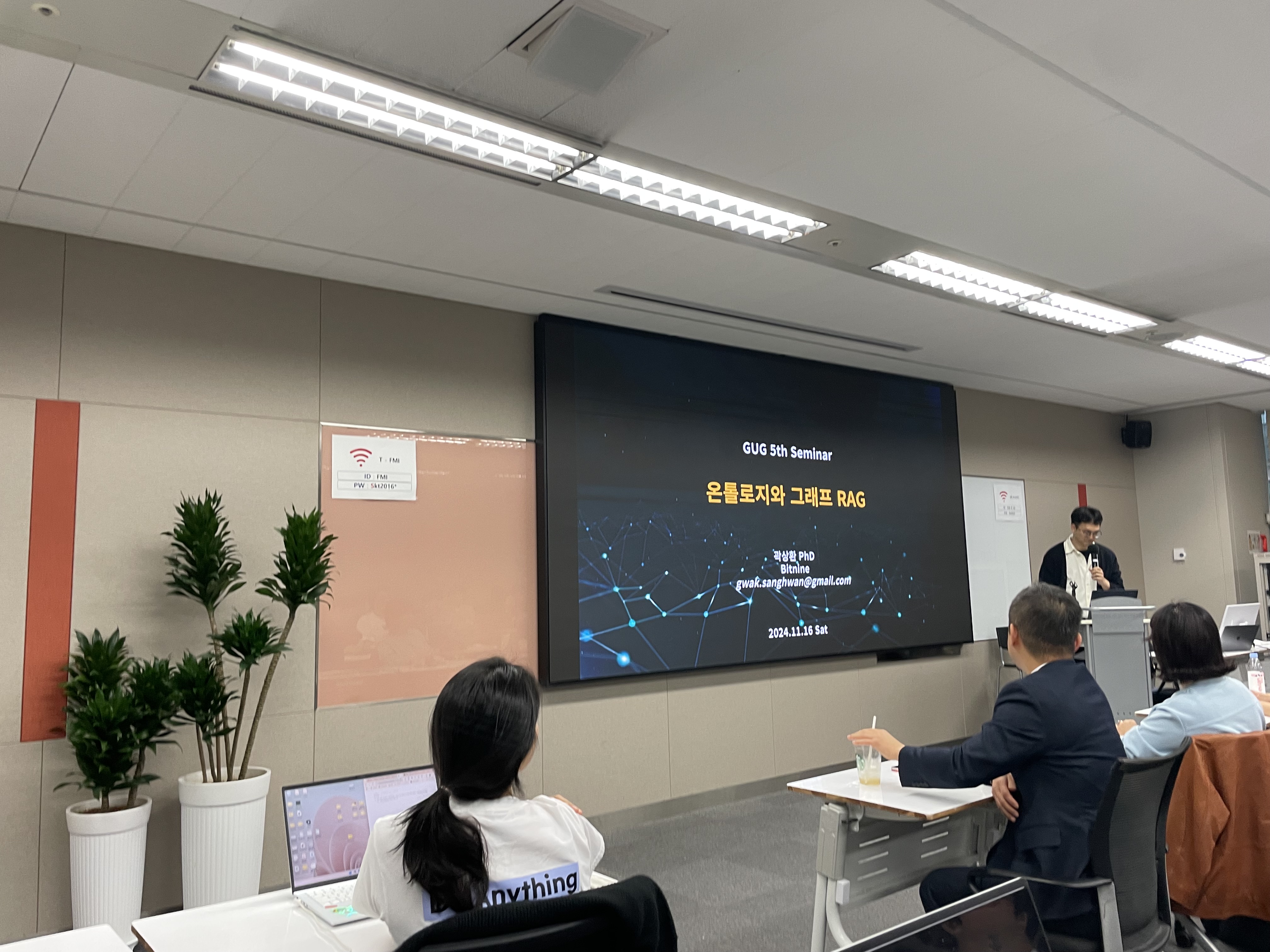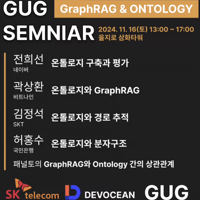 GUG, 그래프 사용자 그룹에서 세미나를 열었습니다. 주제는 <GraphRAG & 온톨로지(Ontology)>로 다섯 명의 연사분을 모시고 진행하였습니다. 패널토의와 함께 멋진 세션으로 좋은 시간이 되었습니다. 실질적으론 GraphRAG, Ontology가 OR로 각 연사자마다 선택해서 강의를 해주셨습니다.
