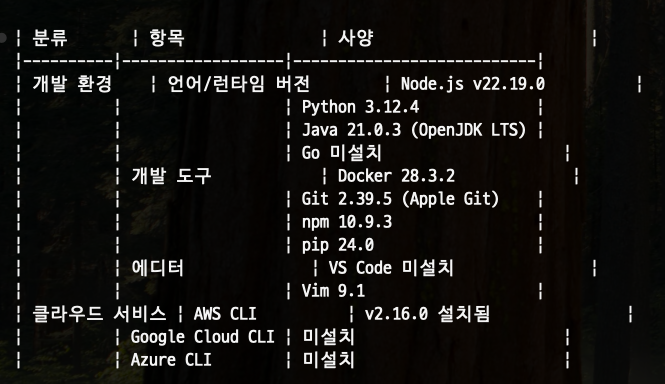 추가로 알아야할 정보도 문의해보니 다음과 같이 나왔습니다. 조금 문제는, Node.js, Python, Java, Go 등 다양한 언어를 설치했는지 확인해주었습니다. 책이랑 거의 비슷한 항목을 보여주는 것으로 보입니다. 클라우드도 AWS, GCP, Azure CLI가 설치되었는지 확인해주고 있었습니다.