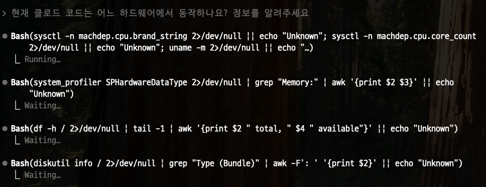 한글로 물어볼 수 있는게 장점입니다. 현재 클로드 코드는 어느 하드웨어에서 동작하는지, 그 정보를 알려달라고 직접 문의를 했습니다.