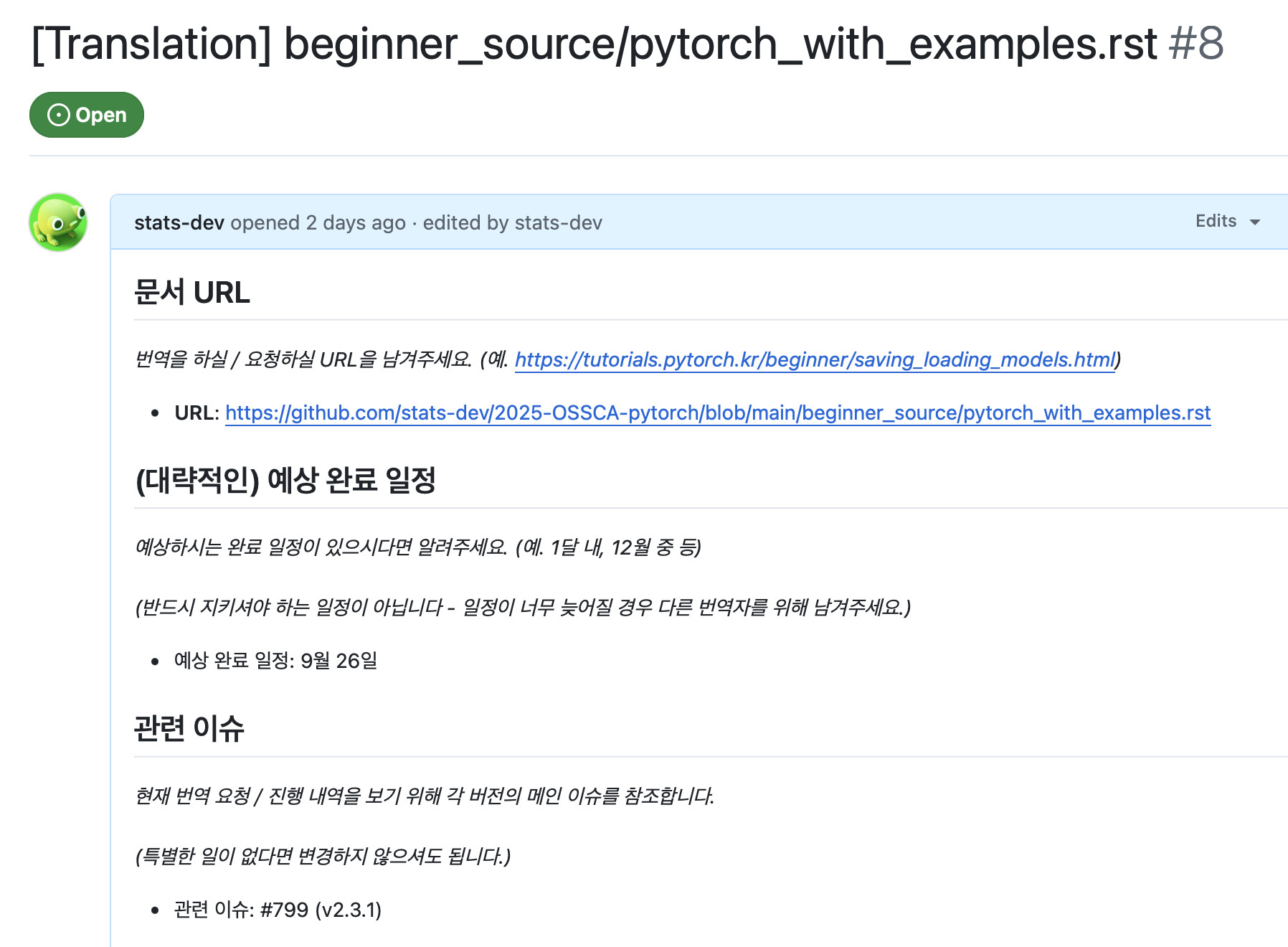 | [OSSCA] PyTorch Korean Localization 2-3주차 후기 (0) | 2025.10.16 |
