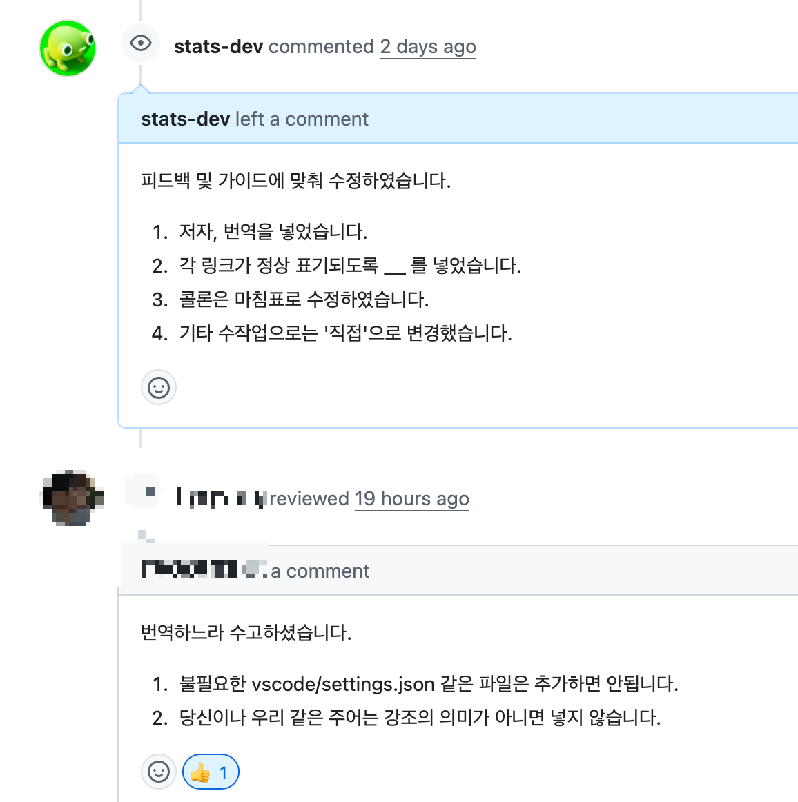 감사하게도 PR 리뷰를 받았습니다. 중요한 점은, 번역은 해당 파일만 스테이징하고, 변경 사항을 보내야한다는 점입니다.