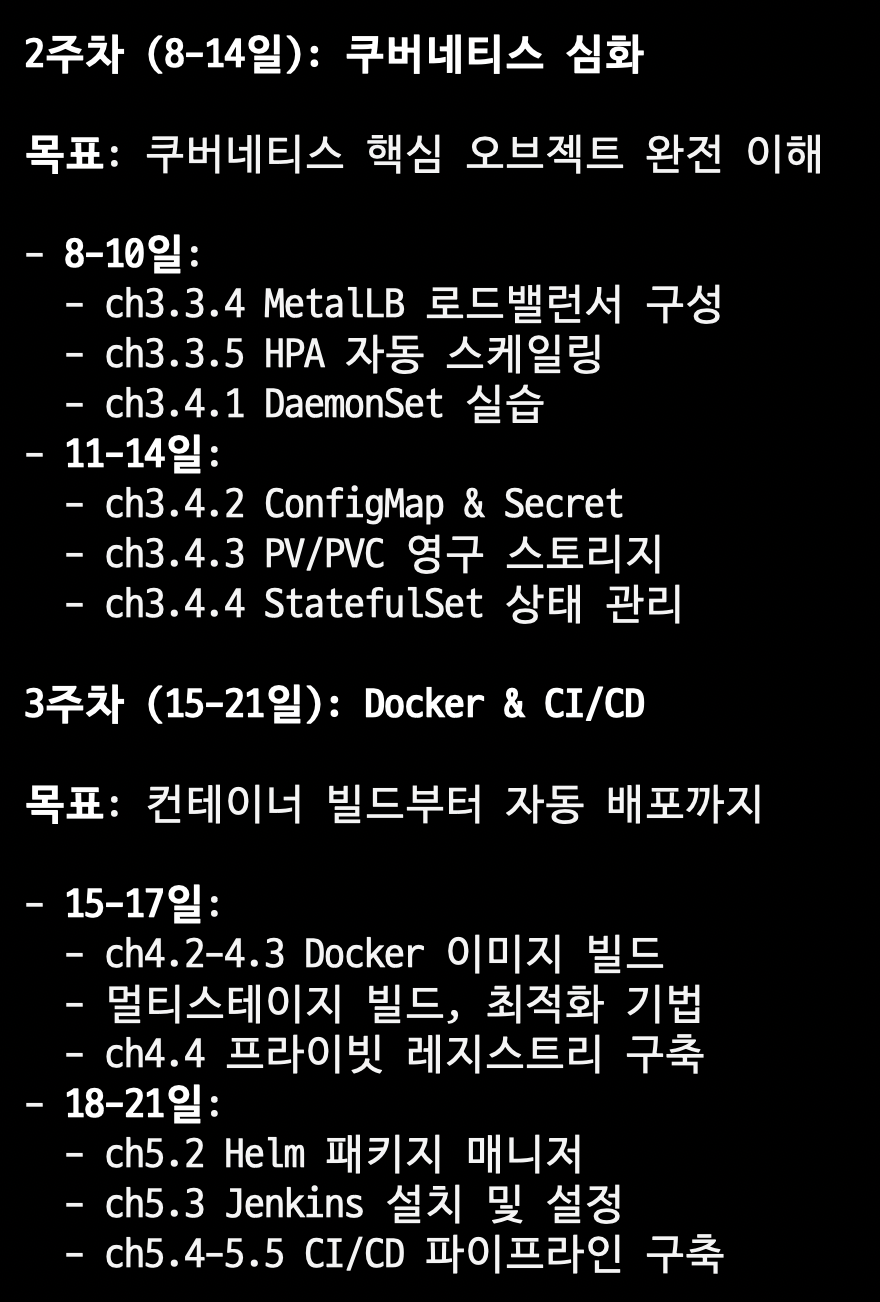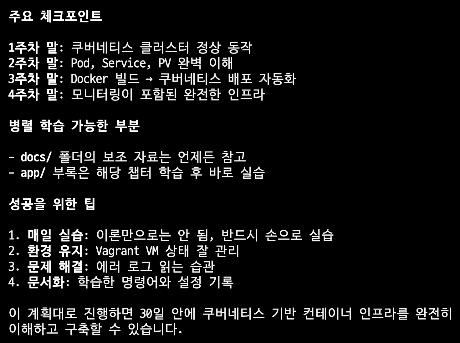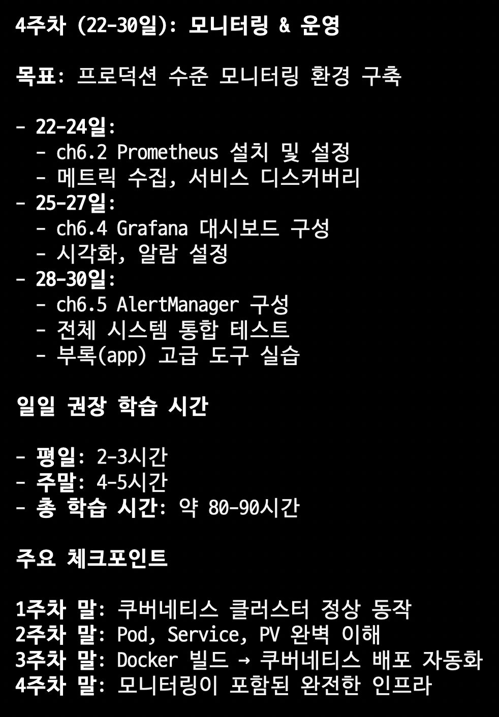 이렇게 주요 체크포인트까지 각 주차별로 잘 정리해주었습니다. 매일 실습을 해야한다고 하고, 문서화가 중요하다고 합니다.