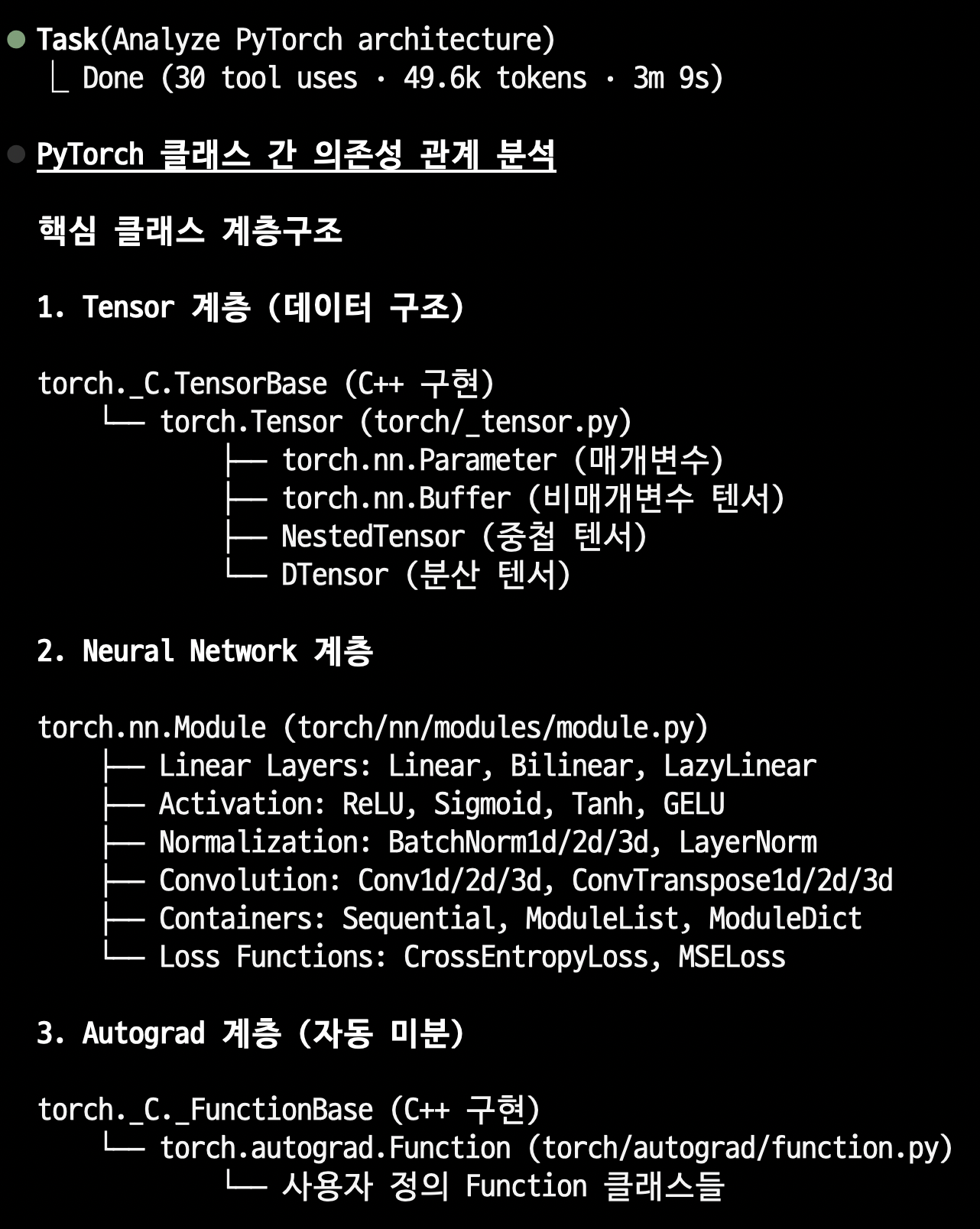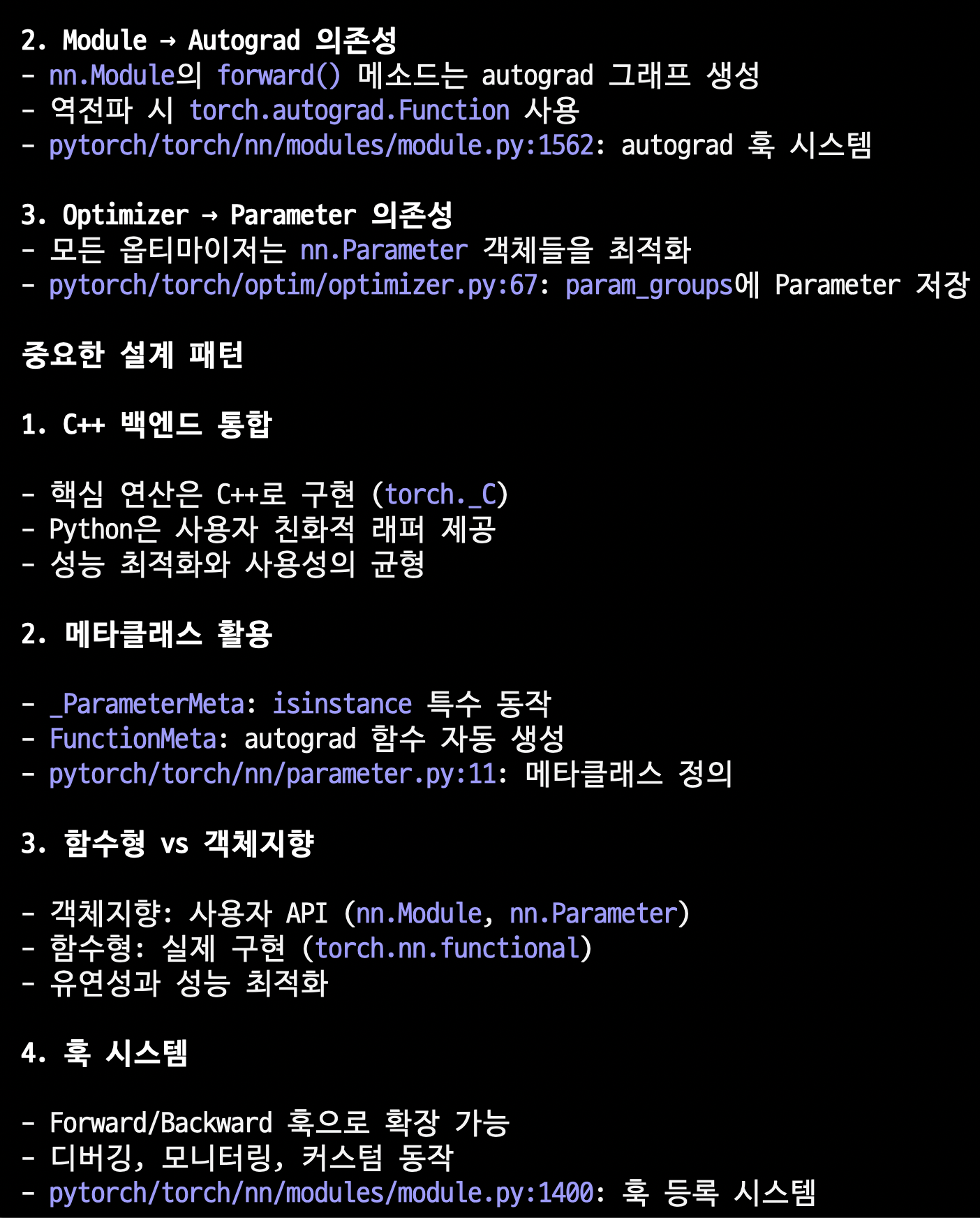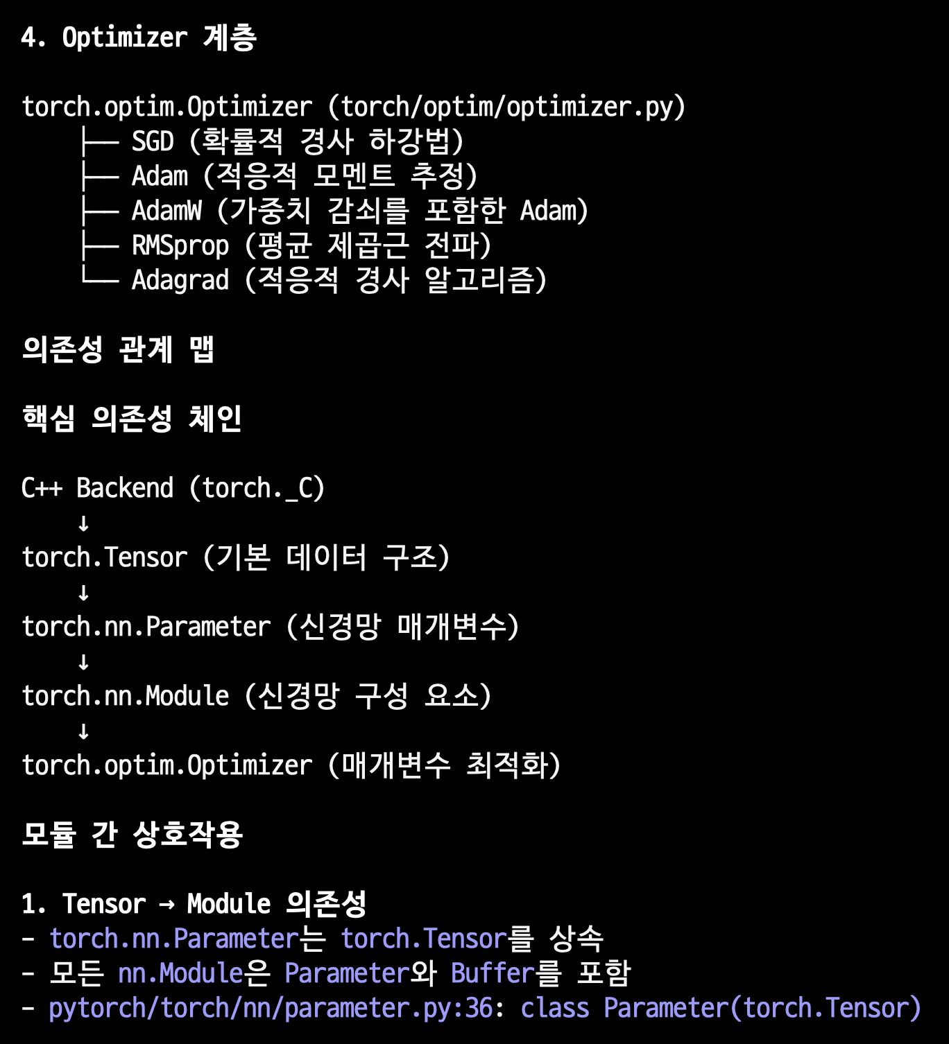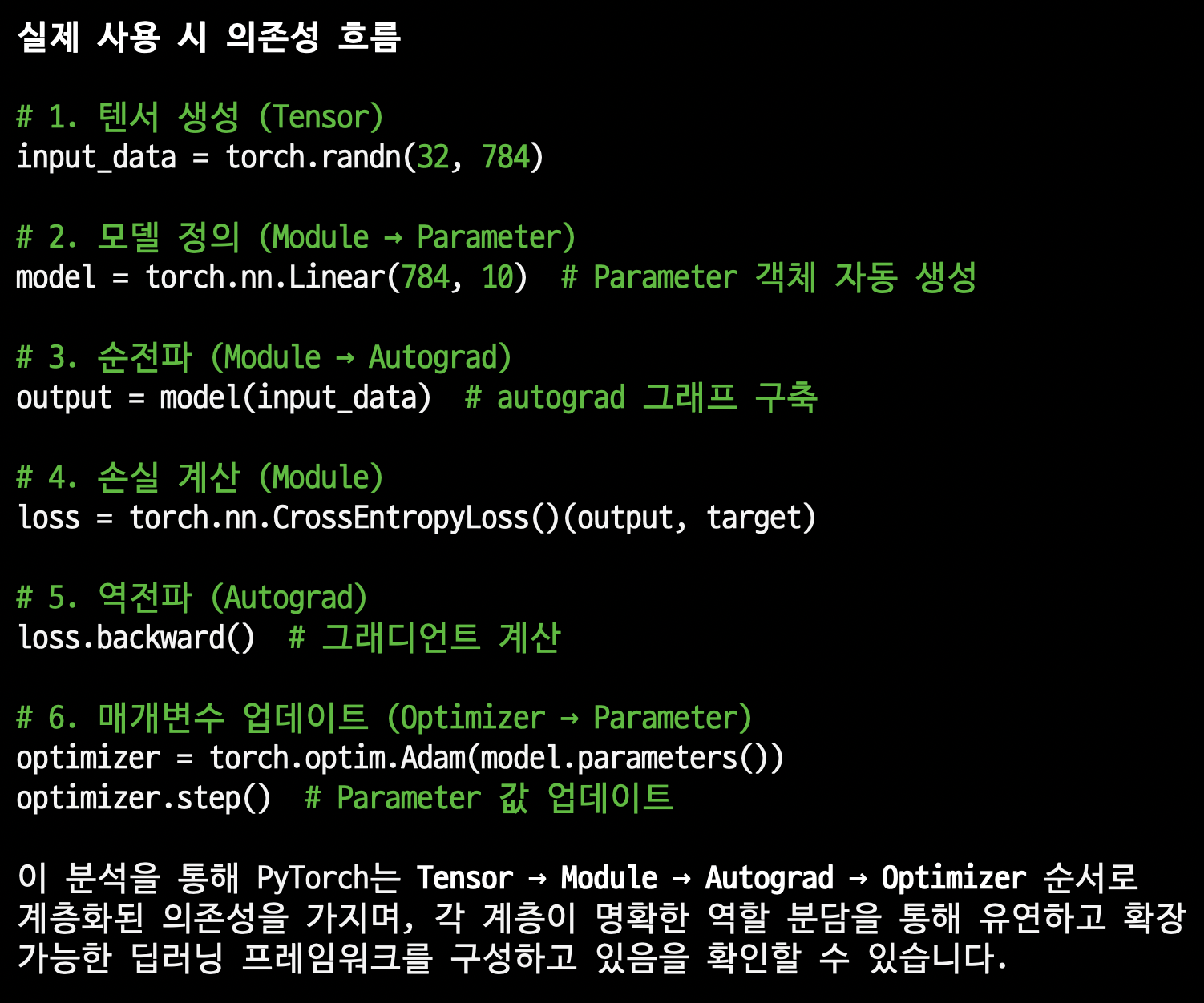 정리하면, PyTorch는 Tensor → Module → Autograd → Optimizer 순서로 계층화된 의존성을 가지며, 각 계층이 명확한 역할 분담을 통해 유연하고 확장 가능한 딥러닝 프레임워크를 구성하고 있습니다.