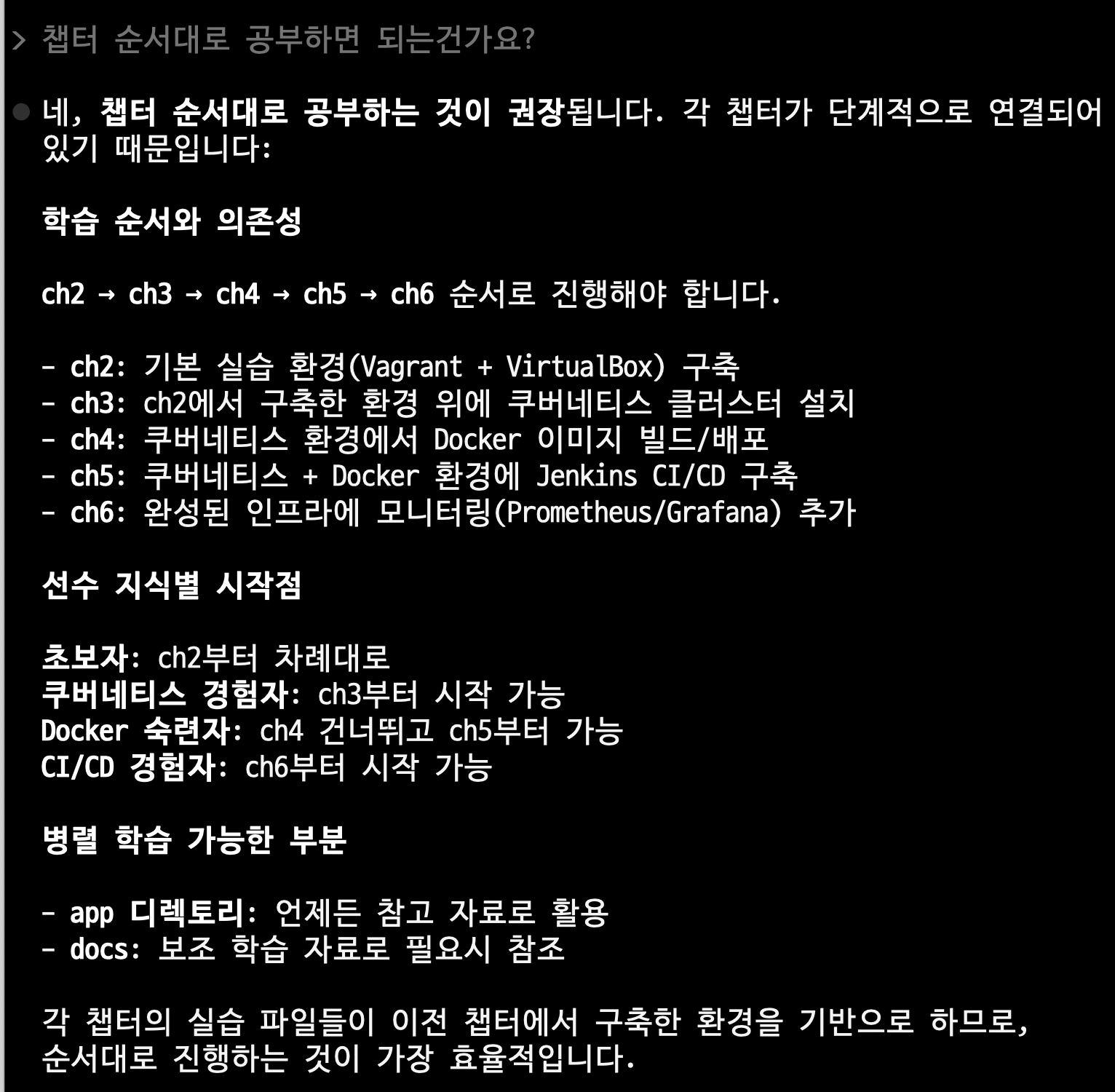 앞에 제시한 챕터 정보를 기억한다고 가정하고, 이제 학습 방법을 물어봅니다.