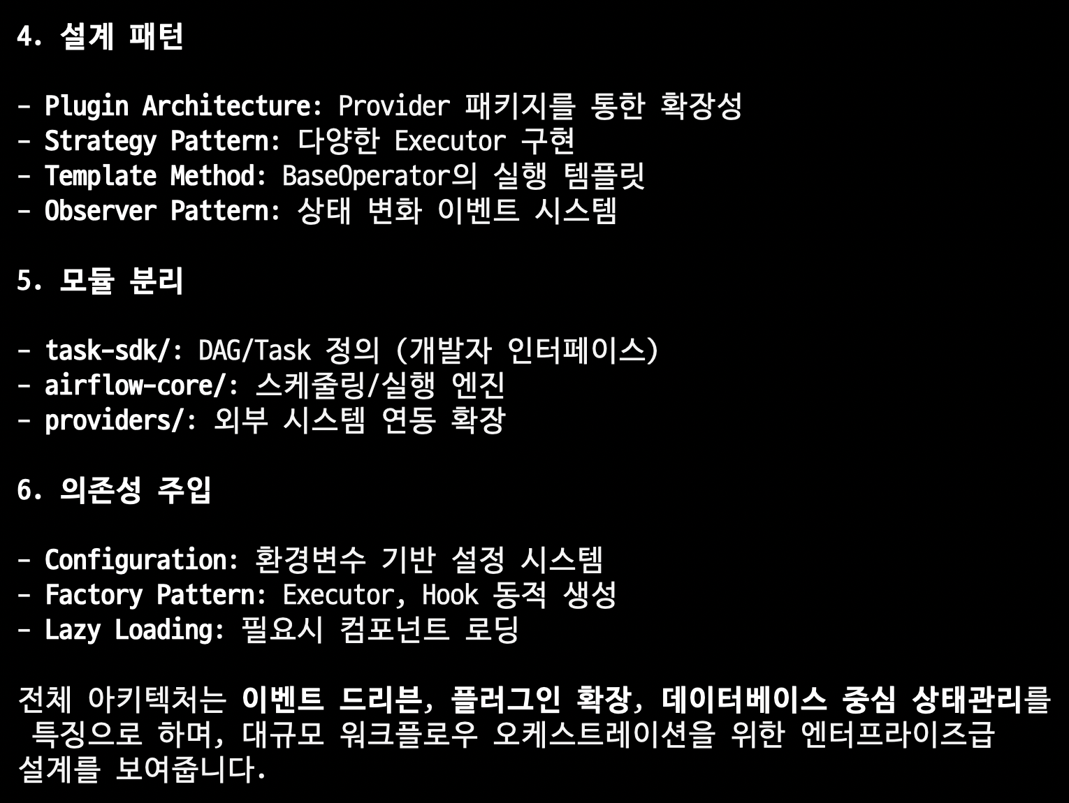 전체 아키텍처는 이벤트 드리븐, 플러그인 확장, 데이터베이스 중심 상태관리를 특징으로 하며, 대규모 워크플로우 오케스트레이션을 위한 엔터프라이즈급 설계를 보여줍니다.
