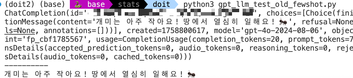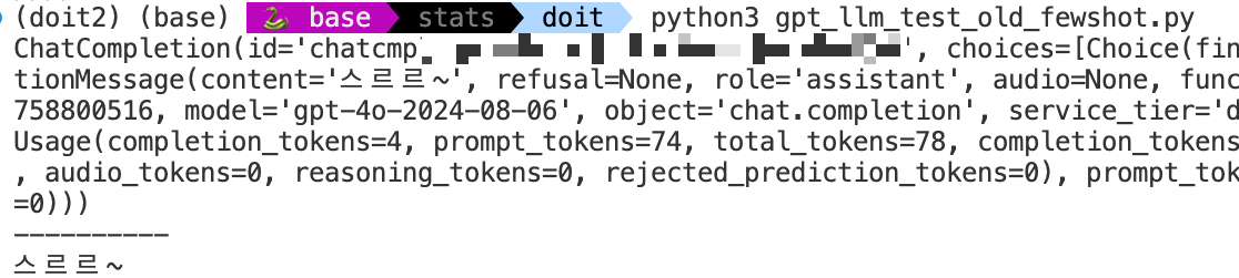 예제 없이 질문하는 것은 제로샷, 예제를 하나 넣어서 질문 하는 것이 원샷, 예제 두개 이상 넣어 질문 하는 것은 퓨샷 프롬프팅이라고 합니다. 실습해보겠습니다.